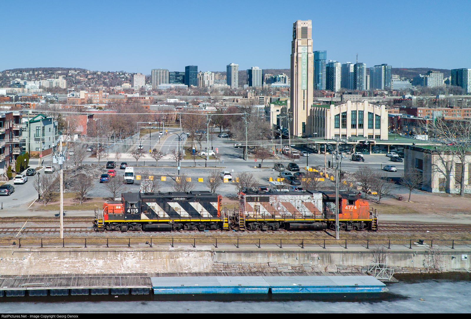 Paired with GP38-2 no. 4774, CN's 4115 is returning light to Pointe-Saint-Charles yard after leaving loaded grain hoppers at nearby Ardent Mills. The track alongside Montreal's Lachine canal passes in front of the Atwater market building.