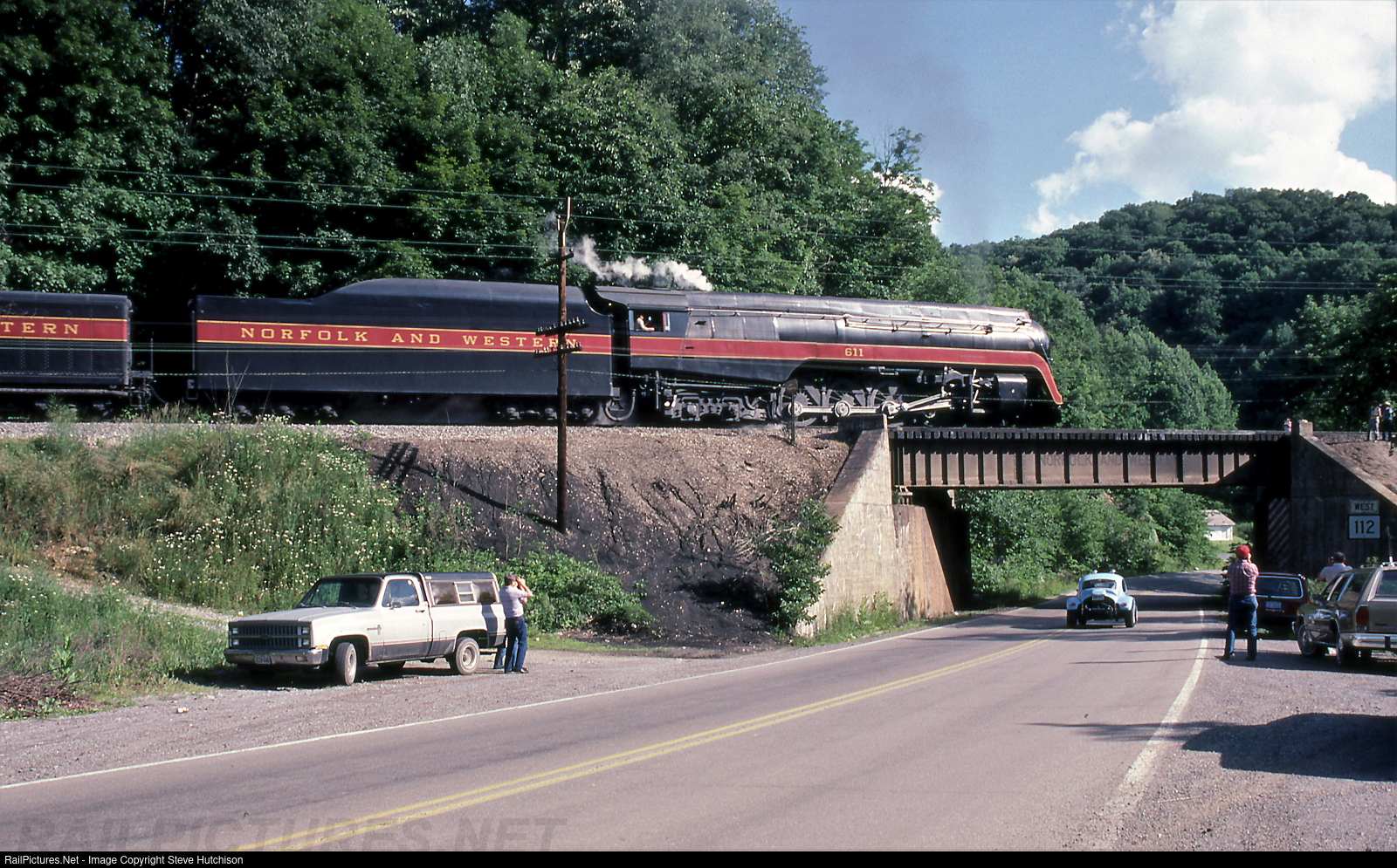 West Virginia State Route 112 follows the former Norfolk & Western right-of-Way, now Norfolk Southern, from Oakvale WV to Ingleside WV, offering many photo opportunities along the way. Here N&W 611 is westbound heading upgrade towards Bluefield West Virginia. Engineer Frank Collins has her running with a nearly clear stack.