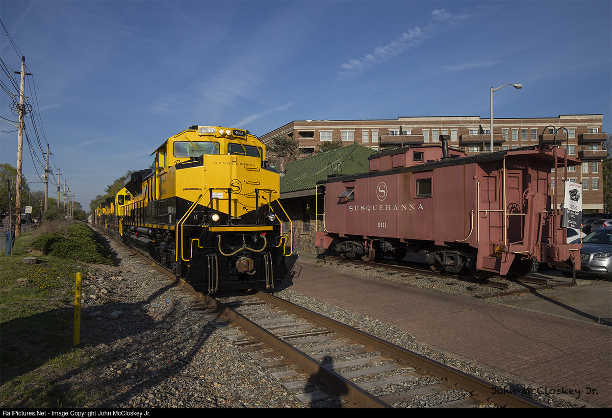 NYSW's freshest repaint SD70M-2 #4066 is seen making its maiden voyage after its release, leading westbound road freight SU-99 past the #0111 caboose in downtown Pompton Lakes.