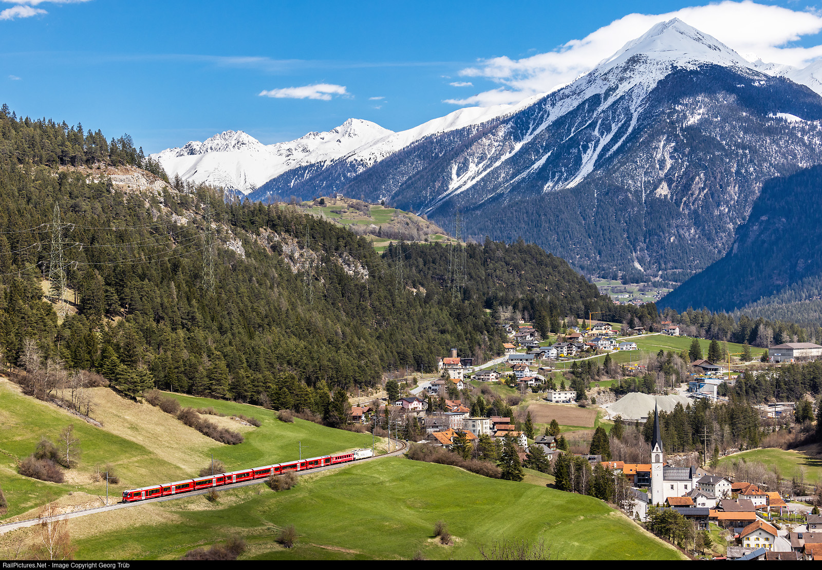 | The Interregio 1144 of the Rhaetian Railway from St.Moritz over the Albula line to Chur is running down between Surava and Tiefencastel, with Ge 4/4 III # 642 in the rear. On the right is the village of Surava, in the background the piramid of the 2622 meter high Muchetta and on the left Leidbachhorn and Aelplihorn, |