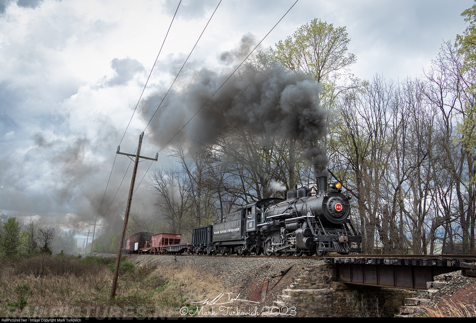 Black River & Western 60 crosses the First Neshanic River with its freight train as the clouds begin darkening.