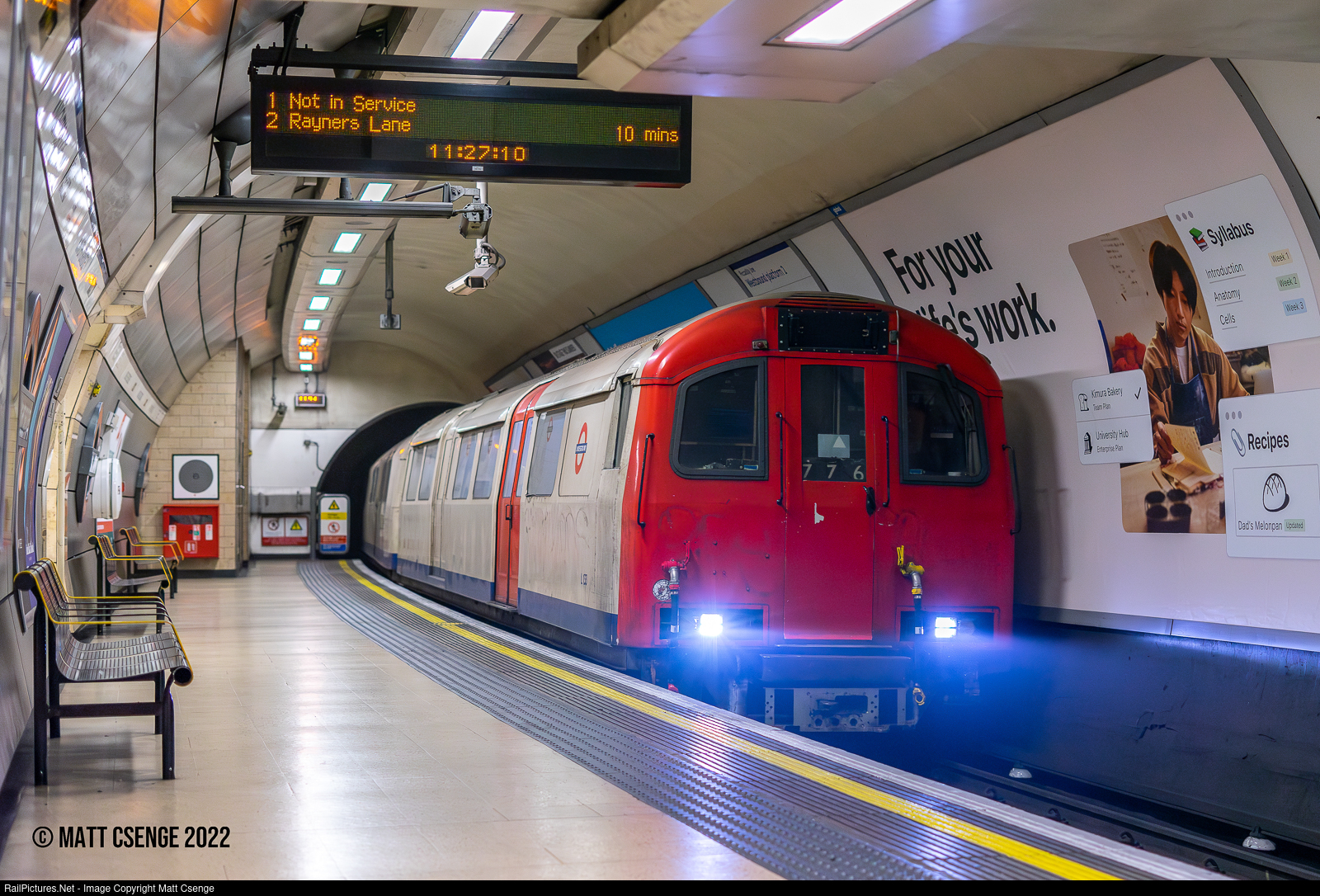 London Underground 1960 Stock no. L133 (Cravens, 1960) is seen leading the Track Recording Train through Knightsbridge station on the Piccadilly Line. As the departure board suggests, this train is not in revenue service but rather is on an inspection run from Uxbridge to Cockfosters. L133 is one of just 12 motor cars that were produced in this class, and is one of 4 that have survived to present day. The center car on this train is a 1973 Stock trailer converted to a geometry car. |