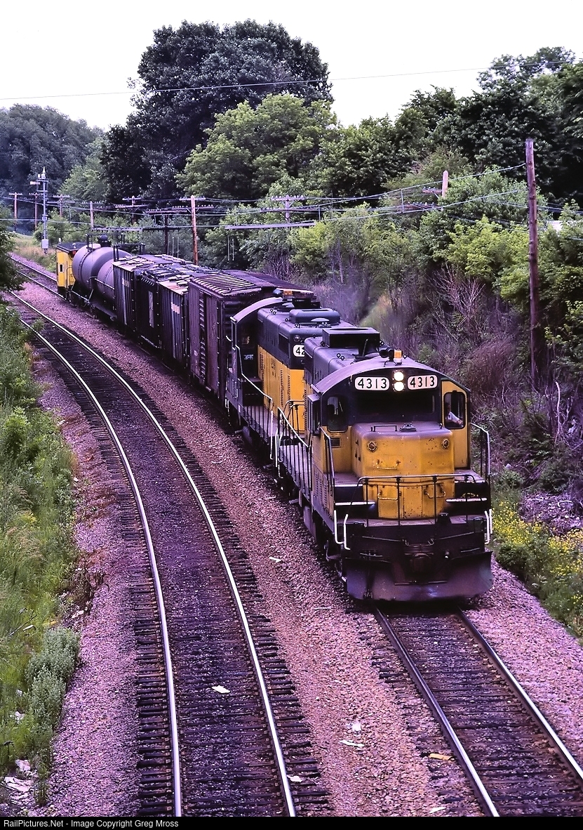 1 of 3...... CNW 4313 and a short train are about to pass under the Whitnall Avenue bridge on Milwaukee's south side in July of 1983. CNW 4313 is ex-CNW 1520 and ex-EMD 300, one of the 3 original EMD GP7 demonstrators. CNW bought the original three and numbered them 1518-1520. 1518 was restored to its' original appearance and donated to the Illinois RR museum.