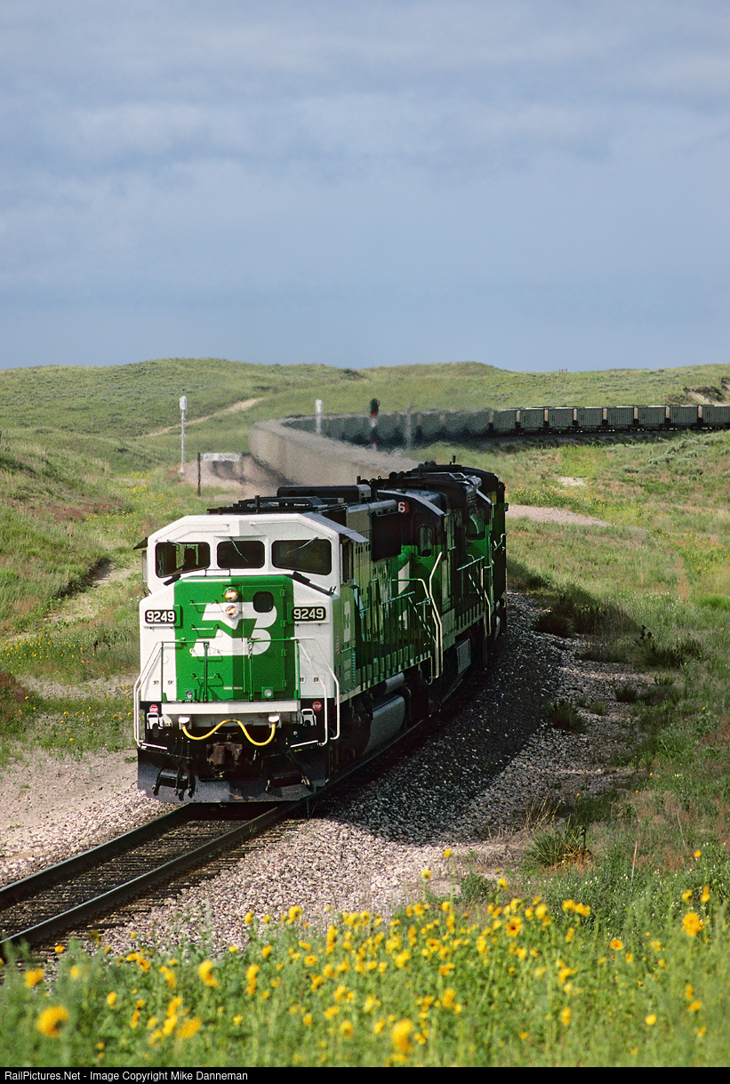 | Burlington Northern EMD SD60M No. 9249 leads a coal train toward Alliance, Nebraska, at East Bonner on July 25, 1992. |