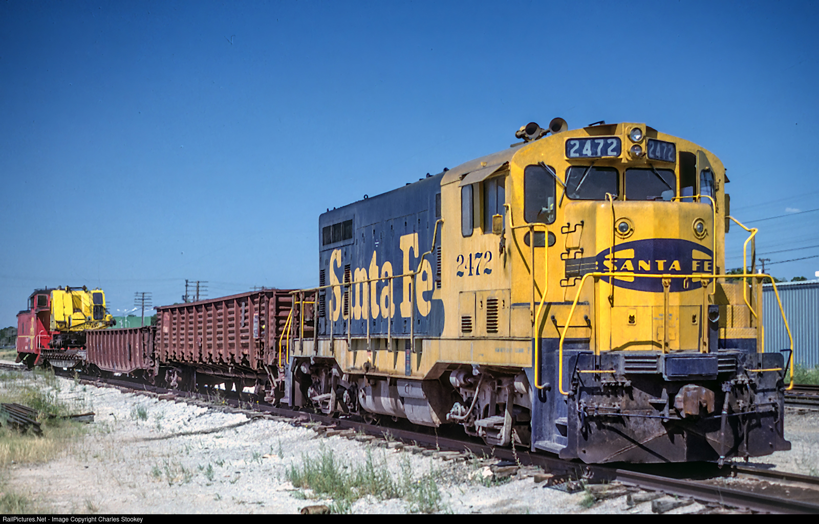 | EDMOND OK Sept 4 1978 — Santa Fe CF7 2472 has charge of Work Train 1. EMD built the unit as F7A 238L in April 1950 in Dream yellow and Blue for freight service. By Dec 31 1976 the Cleburne TX shops rebuilt it as CF7 2472 with a round roof and painted it Yellow Warbonnet. Santa Fe retired it and General Electric acquired it in December 1984. In March 1985 it was sole to The Blue Mountain & Reading RR as BMRG 2472. It was later sold to National Equipment Company and then to IMC Fertilizer which renumberd it to 204. My photo.