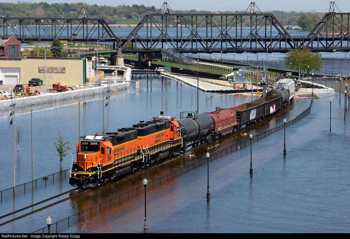 BNSF GP38-2 2099 leads BN Rock South through the Mississippi River floodwaters in Davenport.