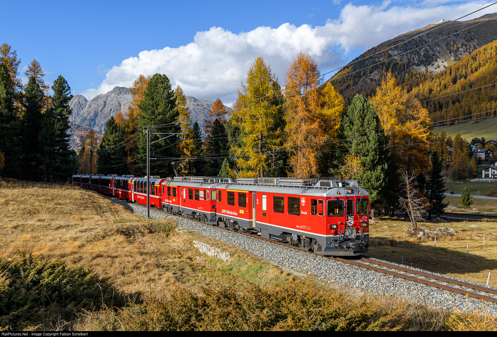 | The Bernina Express 975 with the two railcars ABe 4/4 III #52 "Brusio" and #55 "Diavolezza" shortly after starting its journey between St. Moritz and Pontresina. |