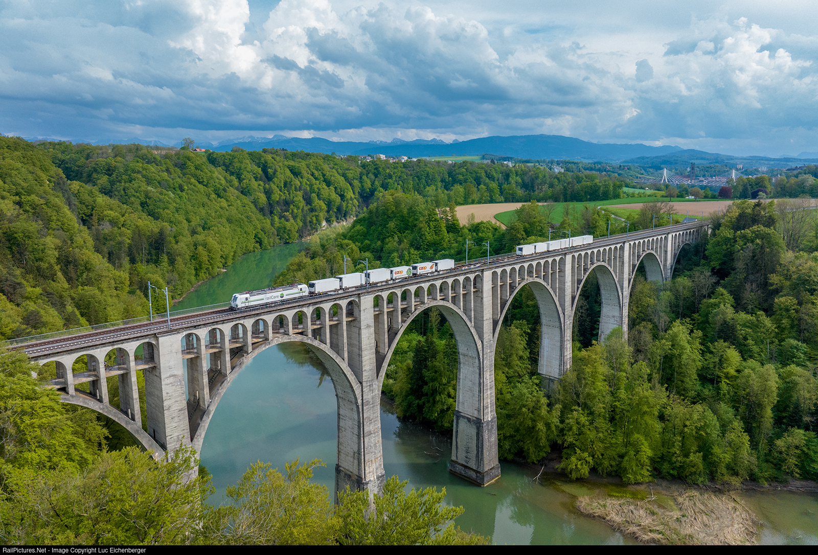 | The Rem 476 454 was with Train 50831 from Vufflens-la-Ville to Dottikon-Dintikon on way. Here between Fribourg and Düdingen on the Grandfey Viadukt. |