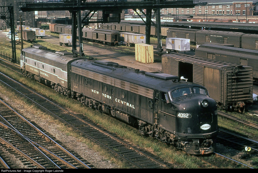 Photographed on September 28, 1961 from the Roosevelt Avenue bridge two NYC E8's 4092 and 4095 idle at Chicago's La Salle Street Station waiting for its next assignment. The E8 4092 was experimentally painted in a solid black color scheme, the paint scheme eventually evolved into a solid gray with a white band to replace the Lightning strips. Photo by Al Holtz, from my collection.