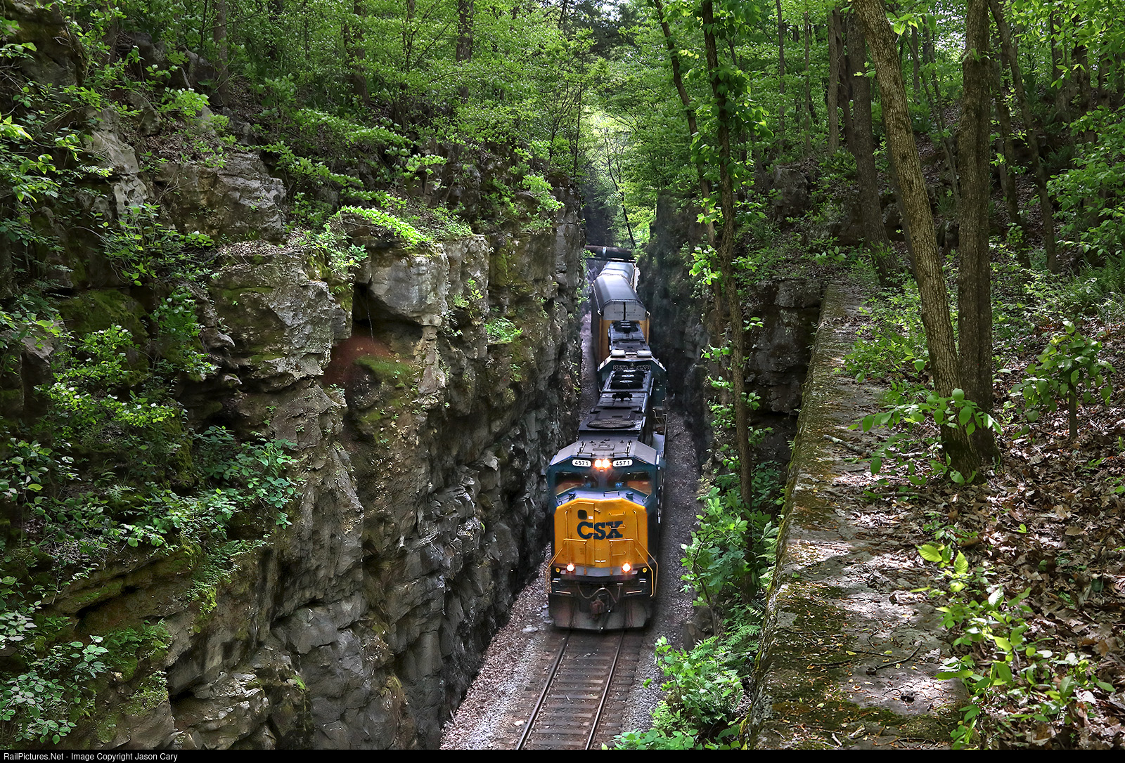 Cumberland Mountain, TN The four and half miles of 2.5% grade make this one of the toughest grades on any mainline in America. The west slope presents an almost equally tough 2.3% grade. CSX bases a set of pusher engines at Cowan, TN to help trains up to and thru the 2228 foot Cumberland Mountain Tunnel. The train here is train 210 and will pull the hill without a manned push as it is powered up with a mid-train DPU. The train puts on quite a show as it climbs with a thunderous echo thru the deep pre-civil war cut and stone work at the Big Hormady Cut. Note the pipe over the tracks above the auto rack, this pipe carries a stream (sometimes dry) over the railroad.