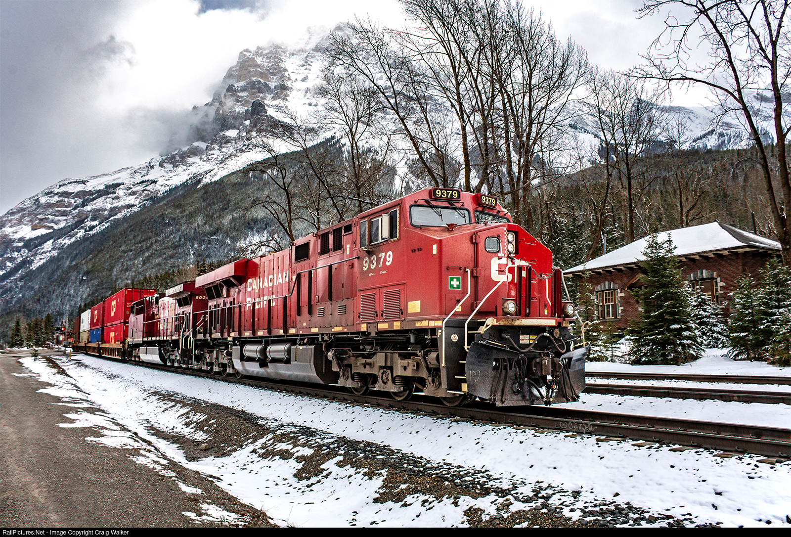 Around 12:30, CPKC Railway intermodal train 113 (Hochelaga, Québec, to Coquitlam, British Columbia), arrived in Field, British Columbia, for a crew change. Besides being on the western side of the Continental Divide (and, therefore, in BC), Field, at an elevation of 4121-feet (1256 metres), is also the western end of CPKC’s Laggan Sub and the eastern end of their Mountain Sub … hence the crew change. (And, I believe, a time zone change as well, even though Field is in the Central Time Zone, most of the Mountain Sub is in the Pacific Time Zone.) And now the railroad will follow the Kicking Horse River (which flows to the Pacific Ocean) rather than the Bow River (which flows to the Atlantic). Canadian Pacific ES44AC 9379 and AC4400CWM 8020 (with AC4400CW 9800 as the mid-train Distributed Power Unit) is crawling to a stop in the shadow (if it were sunny) of Mount Stephen. (Field, British Columbia, Canada – April 17, 2023)