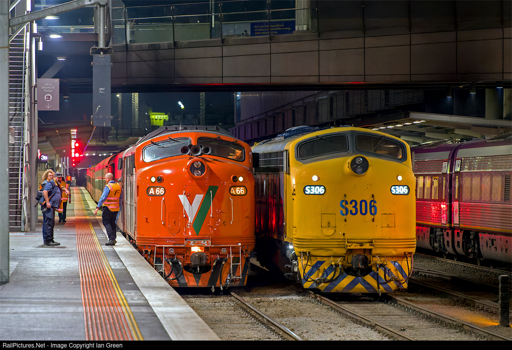 Heritage locos S306 and A66 manoeuvre around Southern Cross Station following arrival from Sea Lake.
