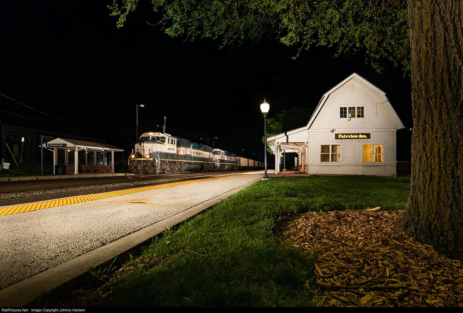 After missing my chance to photograph this rare BN executive SD70MAC duo leading eastbound coal loads for the NS, I made sure to not miss my chance to get them coming back west with empties, even if that required pulling an all nighter… It’s about 02:45 in the morning as BNSF E-CNMWTM flies west with coal empties for Powder River Basin In Wyoming. SD70MAC’s 9687 and 9407 lead, both former Burlington Northern. They are seen passing the historic Chicago, Burlington & Quincy depot at Fairview Avenue Metra station in Downers Grove.