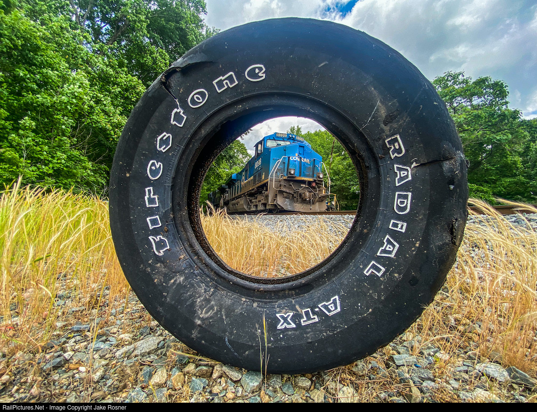 NS 8098, the Conrail heritage unit, and an AC44C6M build their empty grain train at the Ingredion Plant on the Winston-Salem Southbound railway, which will later be numbered 55W (Winston Salem - Lafayette IN). Seen here trough a tire we found sitting on the ground.