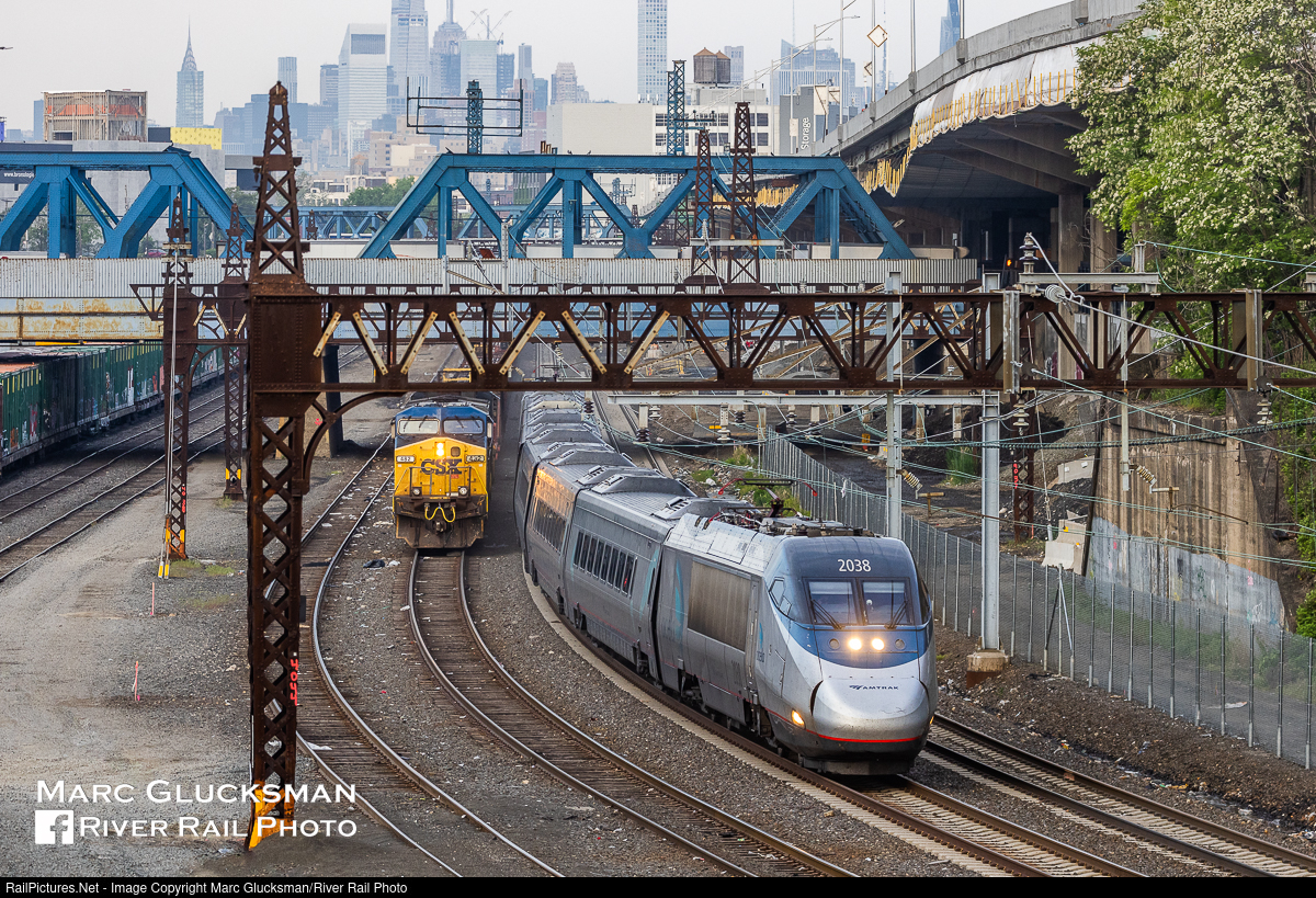Flying' On A Friday. CSX M701-11 has just arrived in Oak Point Yard in the Bronx ,New York with CSXT 482 (AC44CW) leading as Amtrak Acela train 2190 (New York, NY Penn Station- Boston, MA South Station) AMTK 2038 flies by as the sun rises on Friday, May 12, 2023. While there is a clear difference between the concrete tie road tracks of Amtrak and the yard tracks of CSX, they were once all part of the New York, New Haven & Hartford Railroad. A variety of buildings rise from the skyline of Manhattan in the background as the Acela runs next to Interstate 278/Bruckner Expressway.