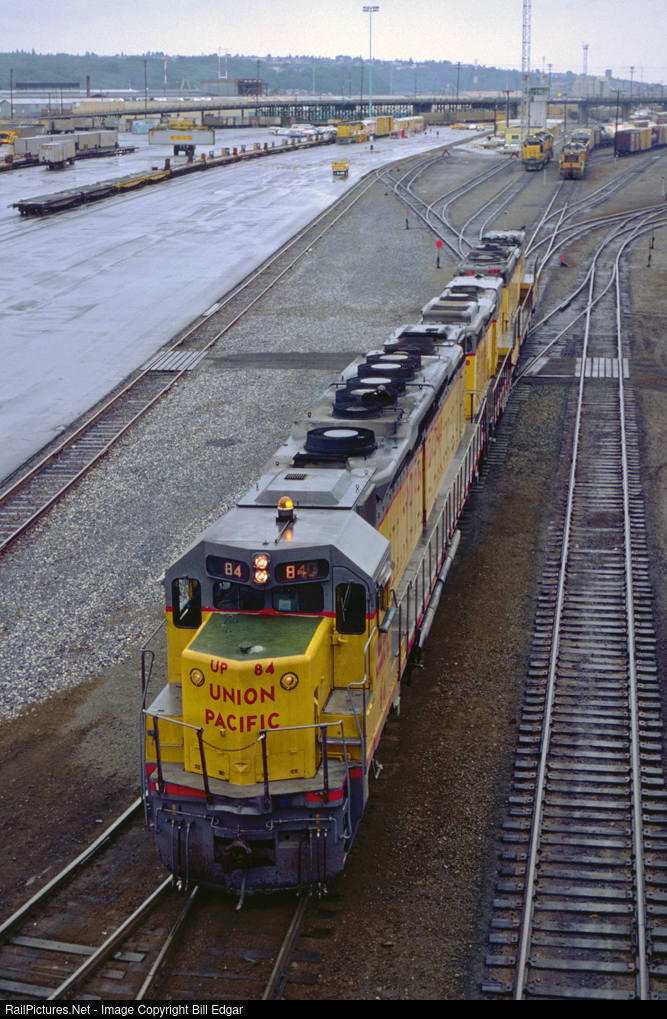 | UP DD35A 84 and a pair of SD24Bs make a move to attach to a southbound freight at Argo Yard, Seattle on a rainy August day that looks more like November. This was Family Days weekend and a small line up of display equipment can be seen in the background left of the yard tower. |