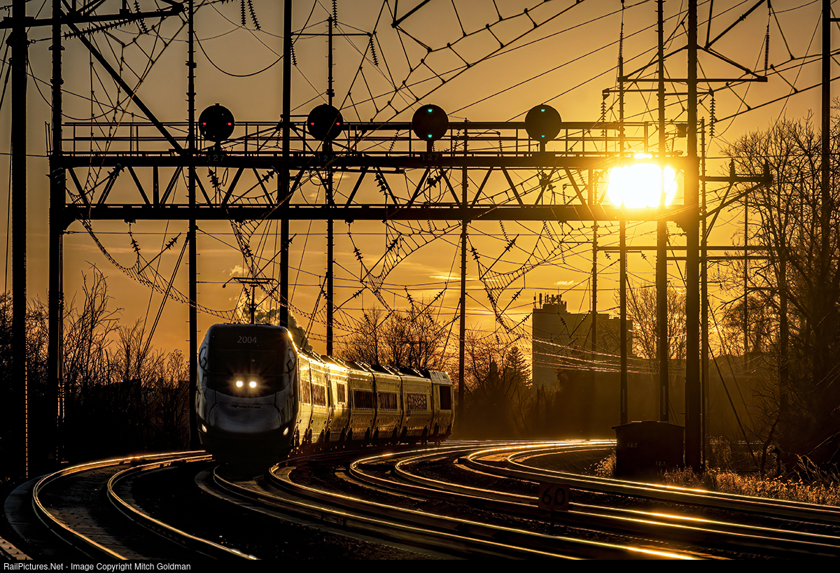 Amtrak's Acela Express, led by AMTK No. 2004, leads a northbound train towards Philadelphia, PA, against the backdrop of the setting Sun. The set is captured ducking the signal bridge at Eddystone, PA.