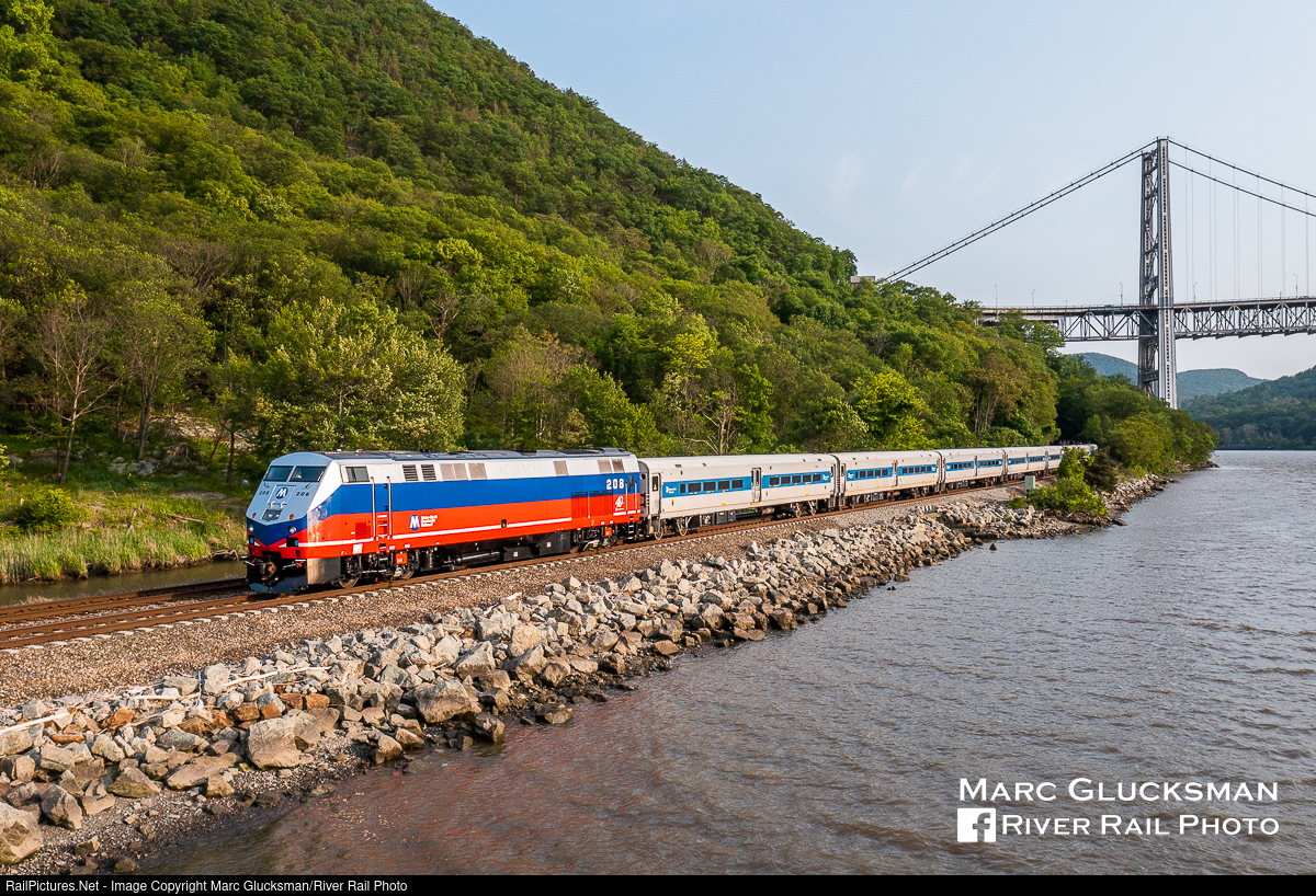 Metro-North's First Heritage Unit. Tuesday, May 23, 2023, marked the first day of revenue service for MTA Metro-North Railroad MNCW 208 (P32AC-DM, Beachball Paint Scheme, 40th Anniversary) since it was repainted. A week prior, it was released from railroad’s North White Plains shop in a commemorative “beachball” paint scheme heritage wrap in honor of its 40th anniversary. This paint scheme was used on the FL9s as well as still being present on some west of Hudson equipment. The day began with the engine facing geographic south, highly unusual for Metro-North Service. Railroad executives had photo sessions with the locomotive at both Croton Harmon and Grand Central. The engine was then returned to its normal geographic north facing position as it made its afternoon trips. MTA Metro-North Railroad President Catherine Rinaldi recently announced that there would be 5 wraps honoring predecessor railroads, to include New York Central, Penn Central, and Conrail. The train is seen approaching the Bear Mountain Bridge in the evening as it returns to Grand Central Terminal.