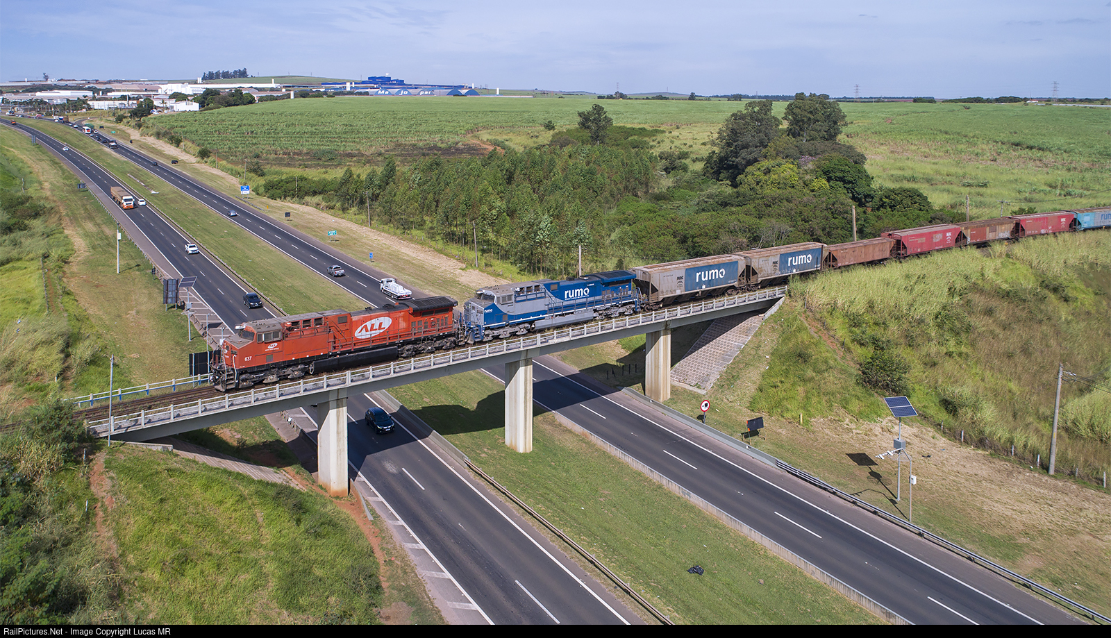 | Southbound loaded train I88, led by AC44i #637 still in the red ALL scheme, photographed in the track section between Rio Claro and Cordeirópolis cities. |