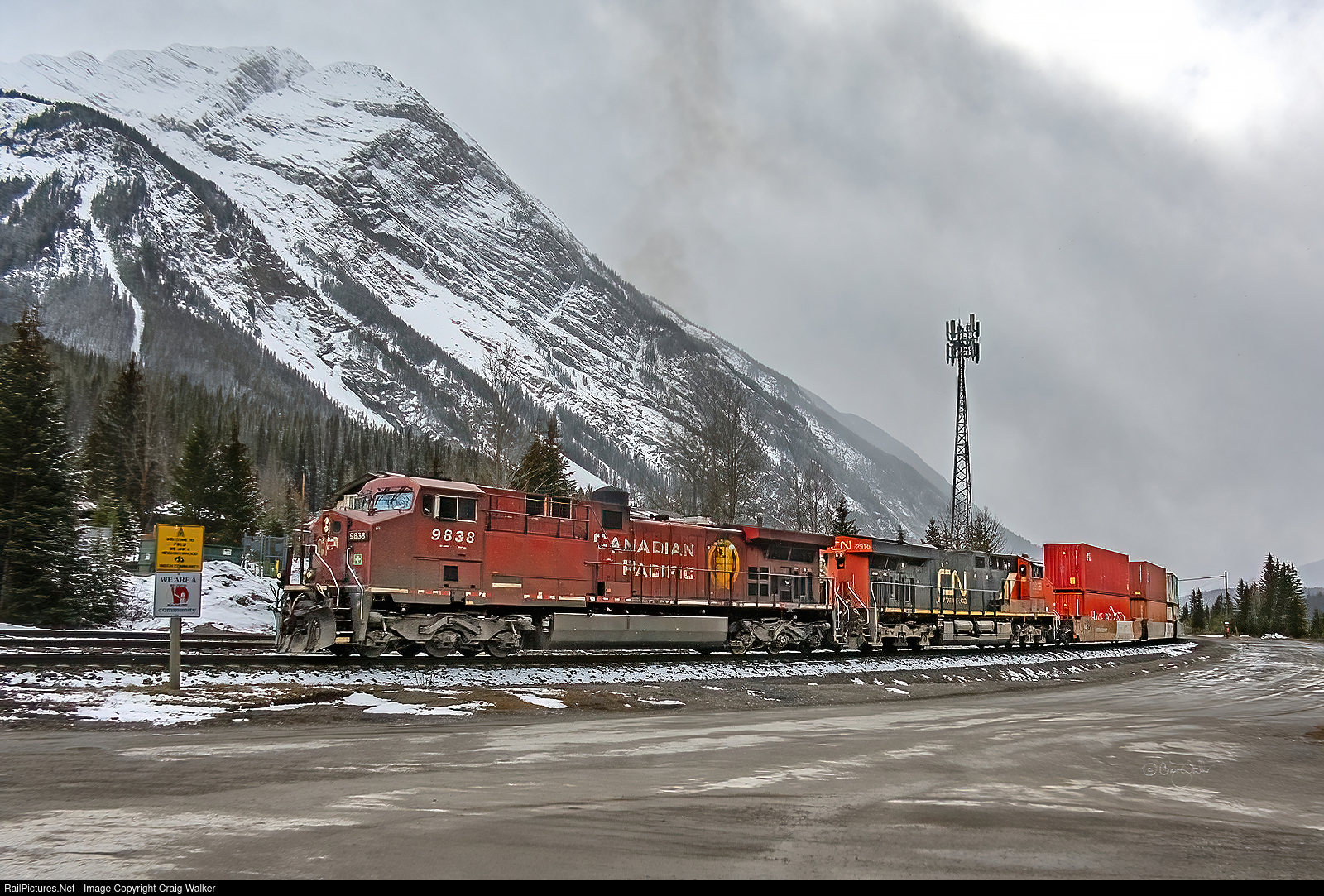 CPKC Railway intermodal train 112 (Vancouver IMS, British Columbia, to Côte Saint-Luc, Québec) has just picked up a fresh crew and has just begun moving east again. Canadian Pacific AC4400CW 9838 and Canadian National ES44AC 2916 are up front, with CN ES44AC 2868 as the mid-train Distributed Power Unit, and CP AC4400CW 9708 for the rear DPU. (Field, British Columbia, Canada – April 17, 2023)