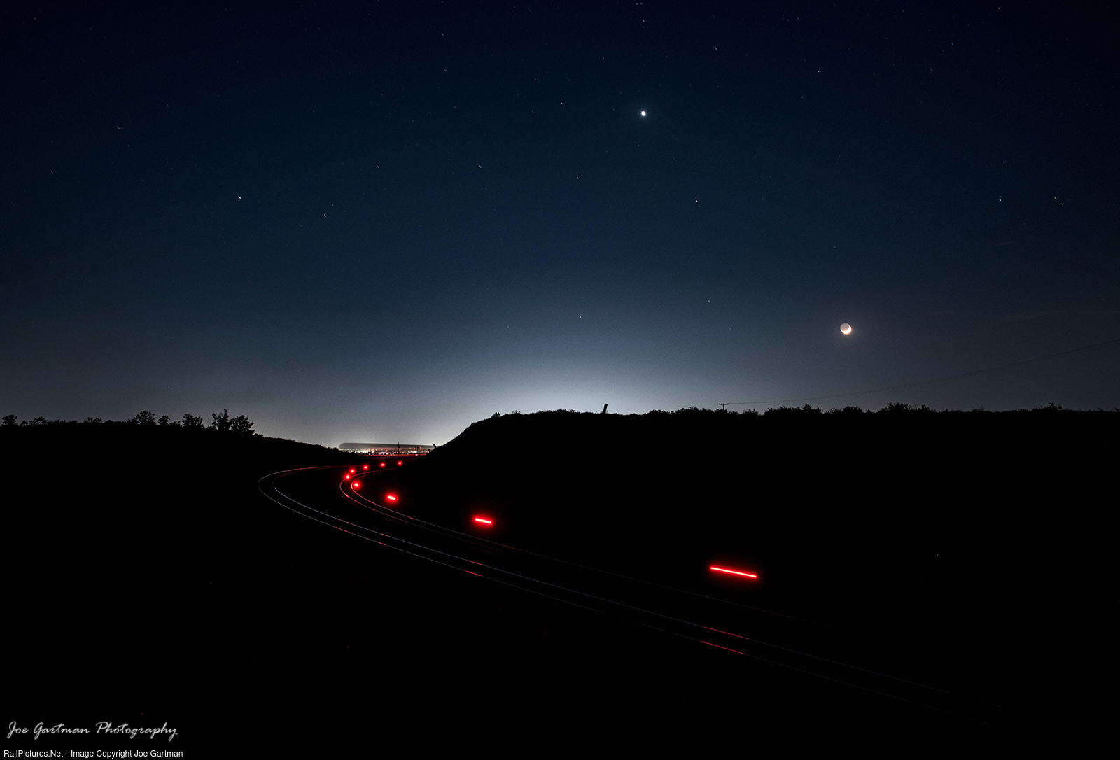 | The city lights of Bakersfield silhouette the cut at Sandcut as the EOT of a Northbound UP train rounds the last curve of the Tehachapi Pass, before reaching Bakersfield. |
