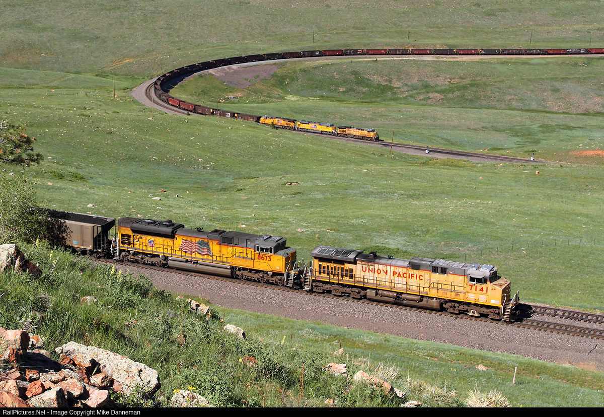 A Union Pacific coal load slowly rolls past Eisele siding (formerly Clay), Colorado, on the afternoon of June 9, 2013. Waiting for the eastbound train down below is a UP coal empty sitting at the west end of Rocky siding, which they will meet in a few minutes.