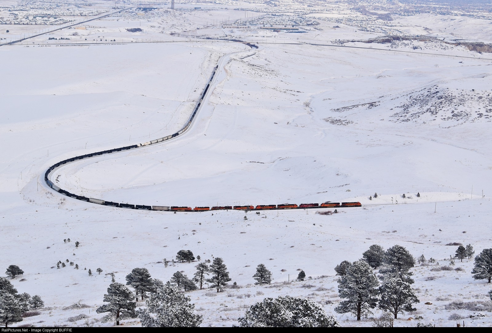 BNSF 7923 (ES44C4) leads an eclectic mix of power as it heads through a snowy Little Ten Curve at Rocky, Colorado.
