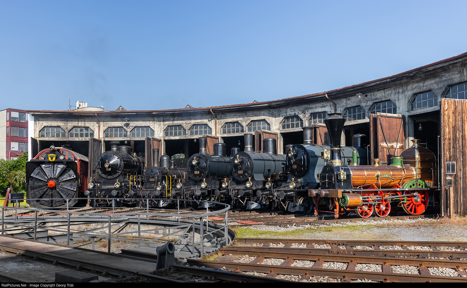 During the open doors day in the roundhouse of Brugg AG, from left to right: Steam rotary snow blower Xrot d # 100 (Henschel 1896), C 5/6 # 2978 (SLM 1917), E 3/3 # 8512 (SLM 1911), Eb 3/5 # 5819 (SLM 1912), B 3/4 # 1367 (SLM 1916), A 3/5 # 705 (SLM 1904), D 1/3 # 1 "Limmat" (Replica SLM and HW Zürich 1947).