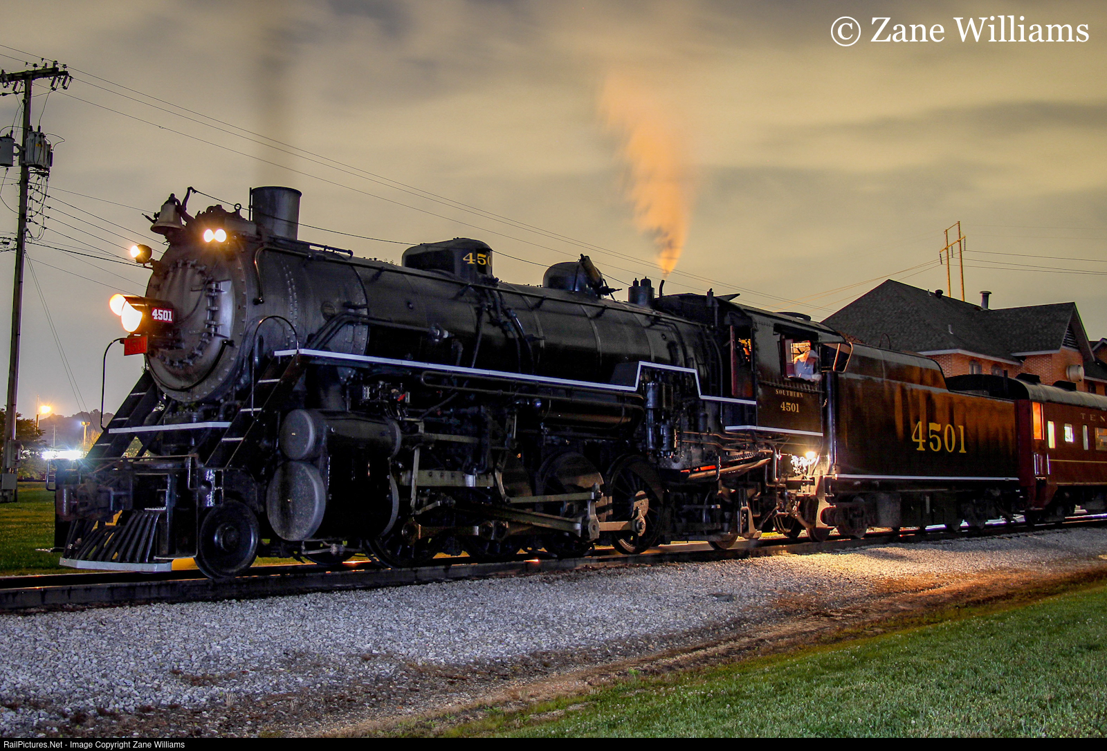 | After completing the second run of the new Evening Ridge Runner, Southern 4501 sits in front of Grand Junction with the 9:15pm train dropping off passengers before turning around on the wye to head back to East Chattanooga for the night |