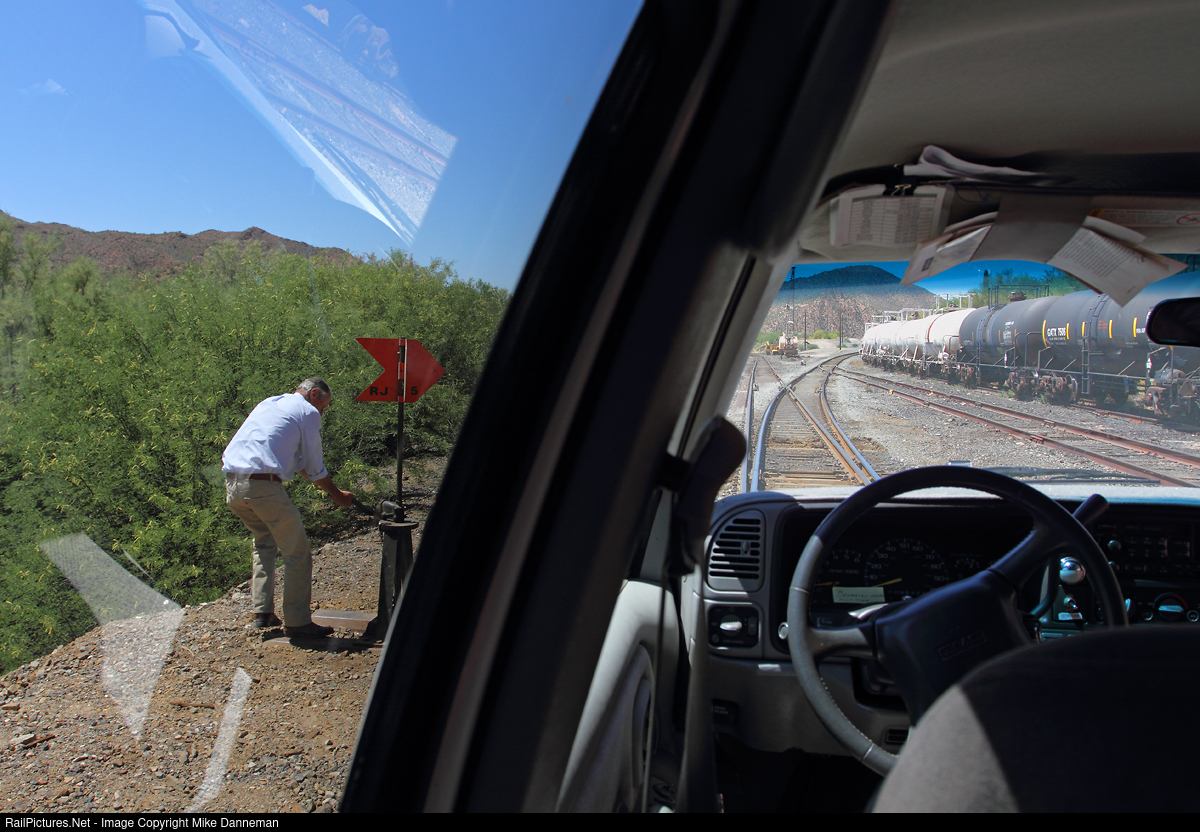 L.S. “Jake” Jacobson, President and Chief Operating Officer of Copper Basin Railway, lines the switch at Ray Junction for CBRY’s main line to Florence, Arizona, during an inspection trip using the company’s GMC Suburban hi-rail on April 21, 2017. Jake, a well-known, liked and iconic railroader, died on July 24, 2021, at age 80.