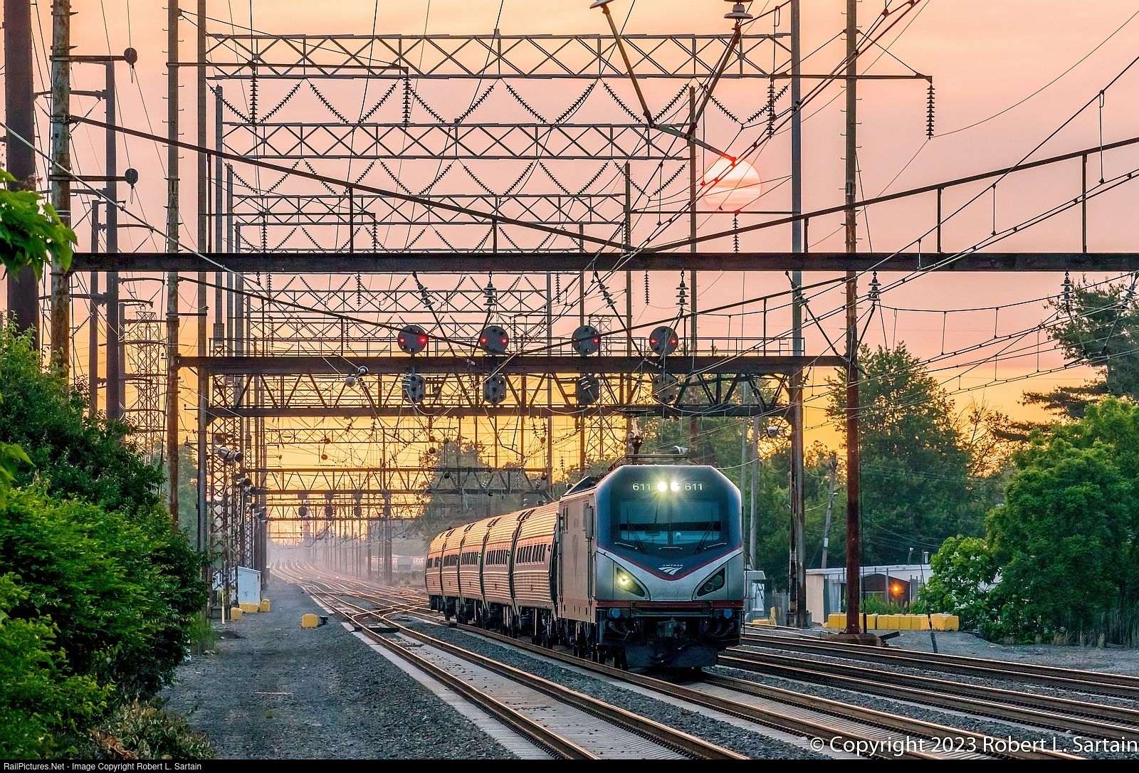 Amtrak Northeast Regional train 151(1) rolls south on three track at HOOK interlocking, past long-closed HOOK tower on the Northeast Corridor. Dawn rises through hazy skies from Canadian wildfires, promising a warm, summer day.