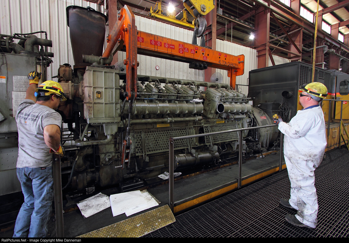 Using the overhead crane, two machinists begin the careful lift of the old prime mover of Union Pacific GE AC4400CW No. 6704 at UP’s South Morrill Locomotive Facility on September 14, 2017. Unfortunately, UP closed this locomotive facility in January 2019, largely due to the decline in coal traffic in the Powder River Basin region.