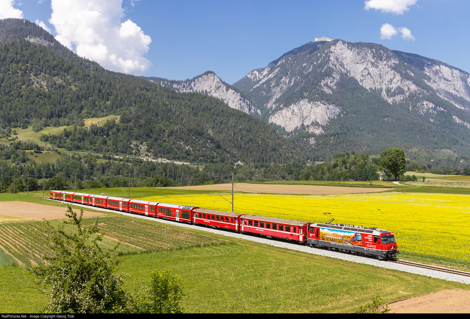 Ge 4/4 III # 644 "Savognin" of the Rhaetian Railway has a publicity paint scheme for the world record of the longest passenger train, and is pulling the IR 1149 from Chur to St.Moritz between Reichenau-Tamins and Bonaduz. In july 2022 the inscription was "Weltrekord-Versuch" (world record attempt) and when the goal was achieved on october 29th, 2022, the inscription was altered to "Weltrekord-Fahrt" (world record run). Behind the locomotive are two second class standard cars type B II, followed by the permanently coupled six car ALVRA trainset, and a cab car At in the rear. In the background is the Calanda mountain. The small field chapel Sogn Mang on the Bonaduz terrace was built in 1773 and restored in 1993. It is dedicated to St. Magnus (Romanesque: Sogn Mang). The special location in the open field with the two mighty poplars invites you to linger.