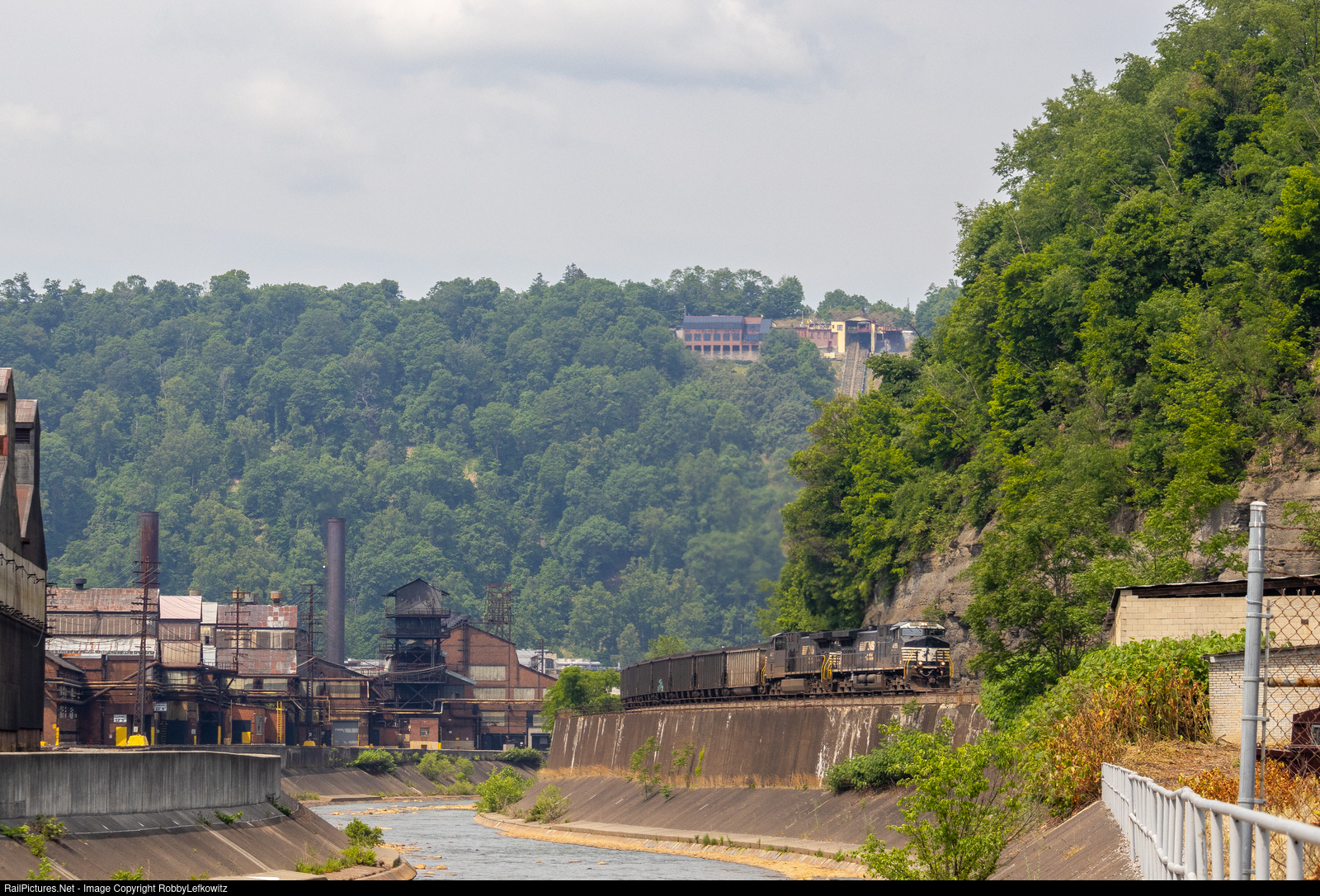 NS 4159 leads loaded coal train NS 590 east through Johnstown as the train wraps around the curve to the east of the Amtrak station. Seen in the background is the Johnstown incline plane, as well as the Conemaugh river and steel plant.