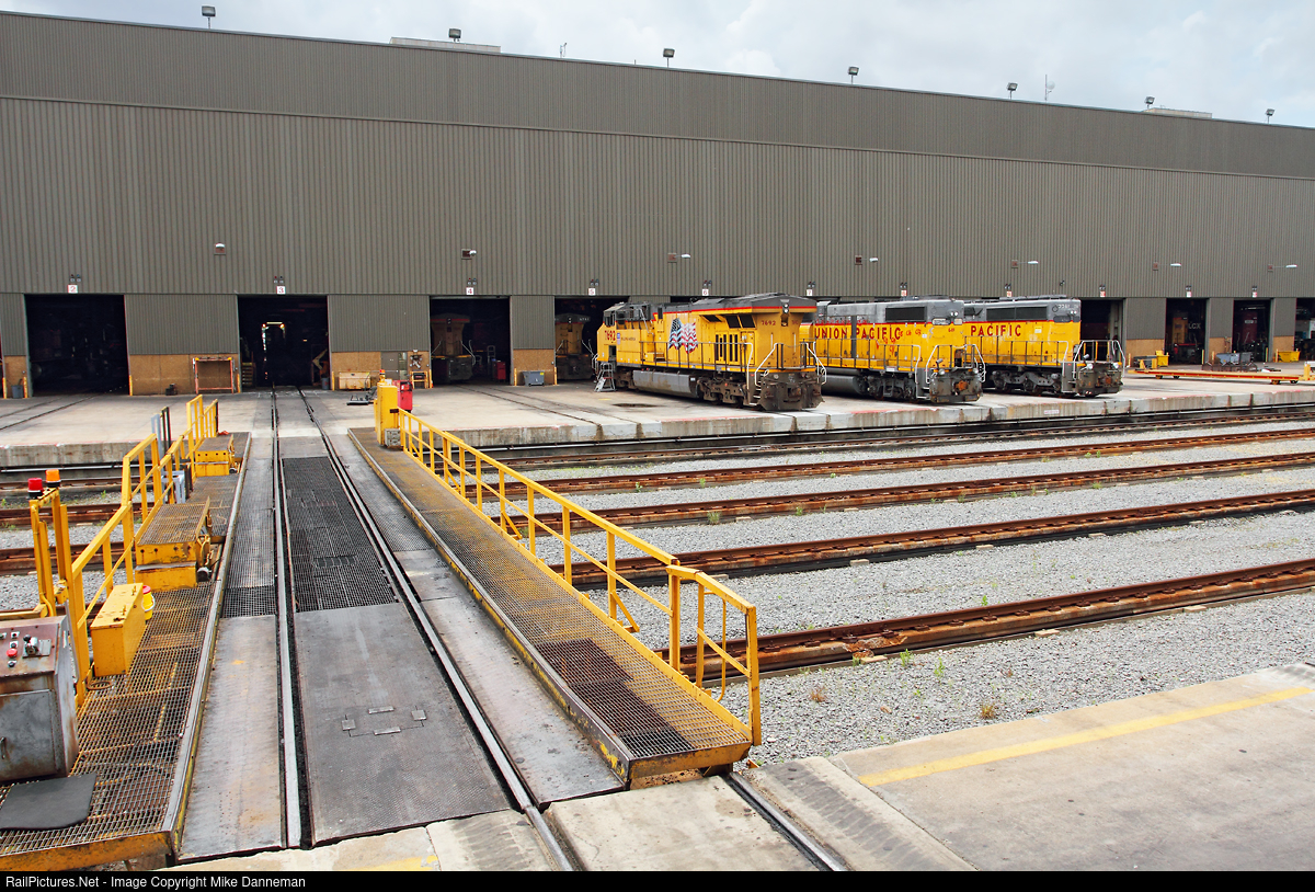 The amount of indoor track space inside the cavernous main shop at Union Pacific’s Downing B. Jenks Shop in North Little Rock, Arkansas, is impressive. On the northeast side of the shop facing the transfer table on May 18, 2015, several UP locomotives await their turn inside, but still have a lot of work done to them outside before hitting the floor.