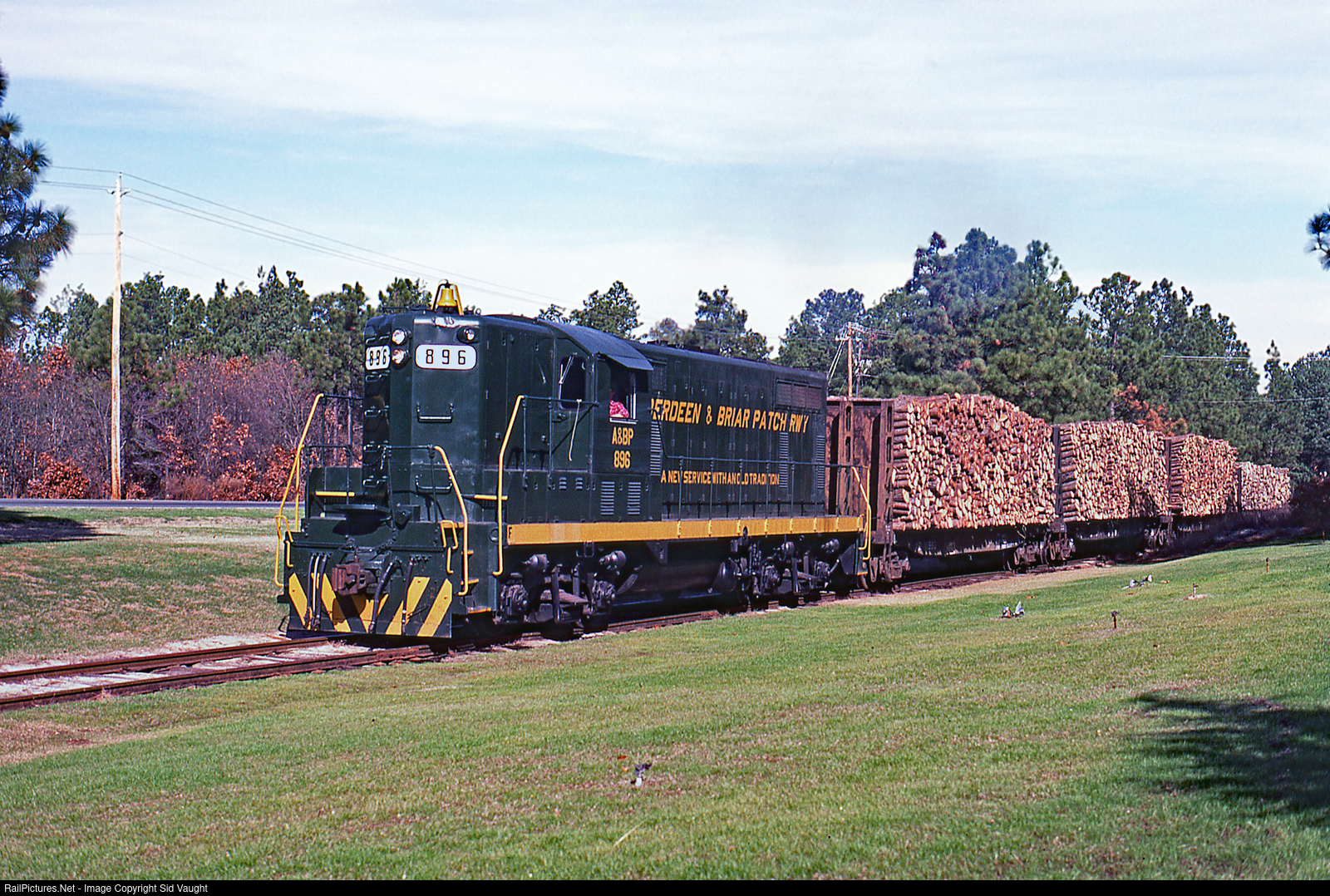 Repainted from its drab ex-SCL paint this is the railroad's entire and is pulling a southbound pulpwood-heavy local. This line, now greatly upgraded, is now part of Aberdeen, Carolina & Western and serves as a connection to CSX main. Photo by Jim Satterwhite.