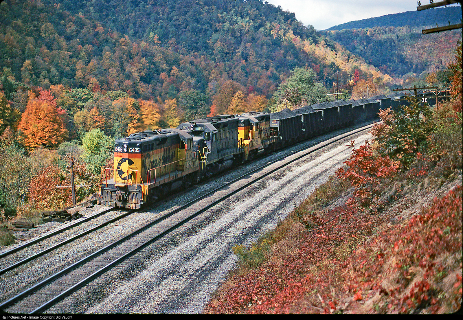 In an oft repeated scene eastbound coal descends Sand Patch Grade somewhere (I'm guessing) close to Fairhope. This was before the 40-2s became boringly ubiquitous. Photo by Jim Satterwhite, from my collection.