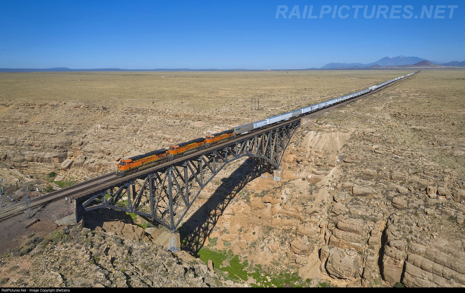 | Eastbound Z-LACALT5 (High Priority Z train from Hobart Yard, Los Angeles, CA to Alliance Yard, Tx crosses the Diablo Canyon Rail Bridge. Diablo Canyon also known as the Devil's Canyon is located on a Navajo Reservation in North Central Arizona and is more than 225 feet deep with steep sides and 500 feet across at the top. The current bridge constructed in the year 1947 replaces its other '2' predecessor bridges the first one completed in 1882 replaced by the second one completed in the year 1900. The area though remote and warrants a sturdy vehicle is close by I-40 between Flagstaff and Winslow and the bridge is lit by Sunlight from day break to dusk on a sunny day helping make some nice pictures of BNSF trains. |