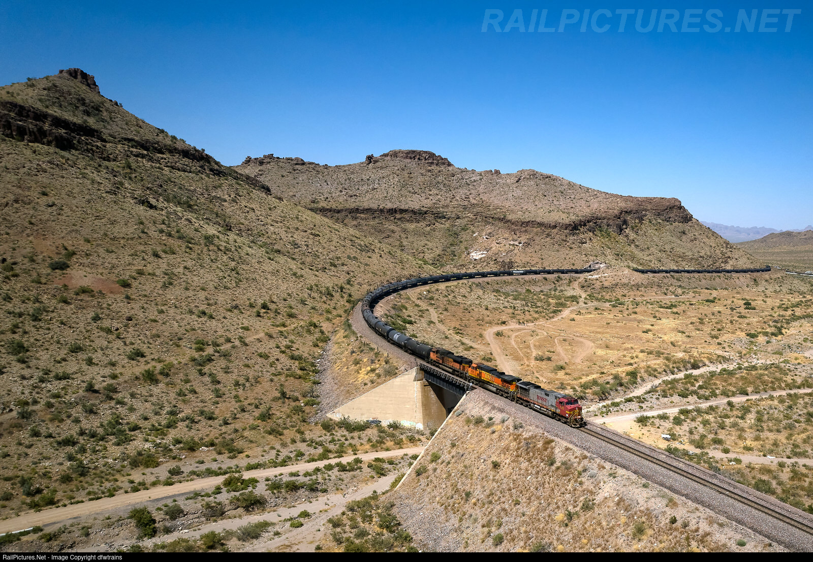 | East Bound Unit Train from Tirgo, CA - Dodge City, KS - (U-TCADDC0) crosses the Kingman hill ranges with a fake bonnet Dash-9 leading the train. This is the up track towards Flagstaff which curves through the hills while the down track toward California closely follows Route66 at this location. |