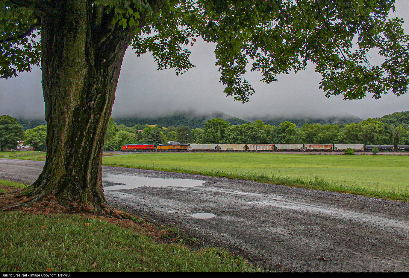 NS 18M drops downgrade in a gloomy late June afternoon. The brilliant colors of the original Norfolk Southern heritage unit contrasted nicely with the fog and rain.