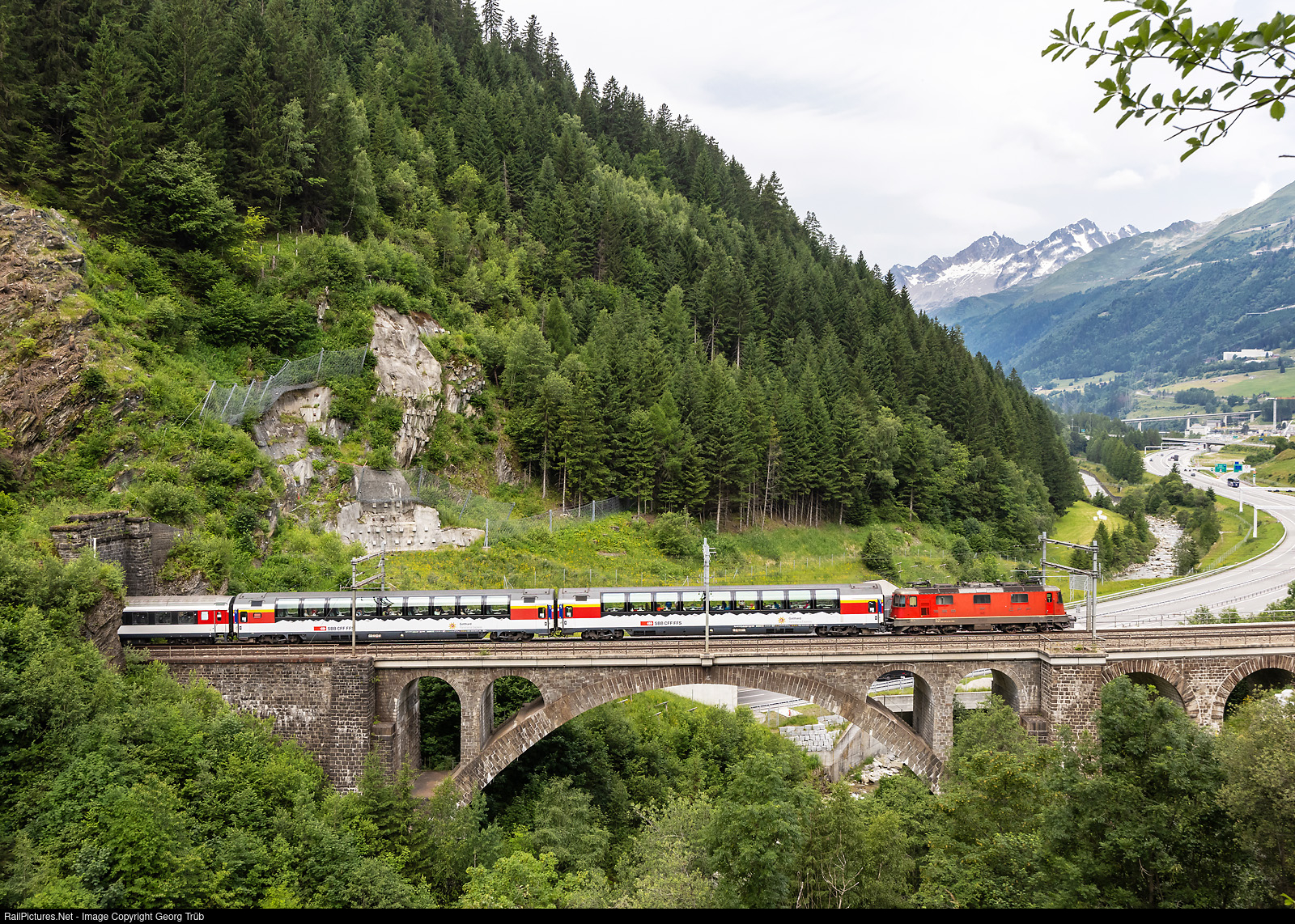 Re 420 # 197 (Re 4/4 II # 11197) of the SBB pulls the GOTTHARD PANORAMA EXPRESS PE 3092 from Lugano over the Gotthard mountain line to Arth Goldau over the Stalvedro viaduct between Ambri-Piotta and Airolo. The train has four Apm panorama cars in the consist. The 83 meter long Stalvedro viaduct was the first on the Gotthard line, which was rebuilt as concrete arch covered with natural stone in 1952. Before it was a truss bridge.