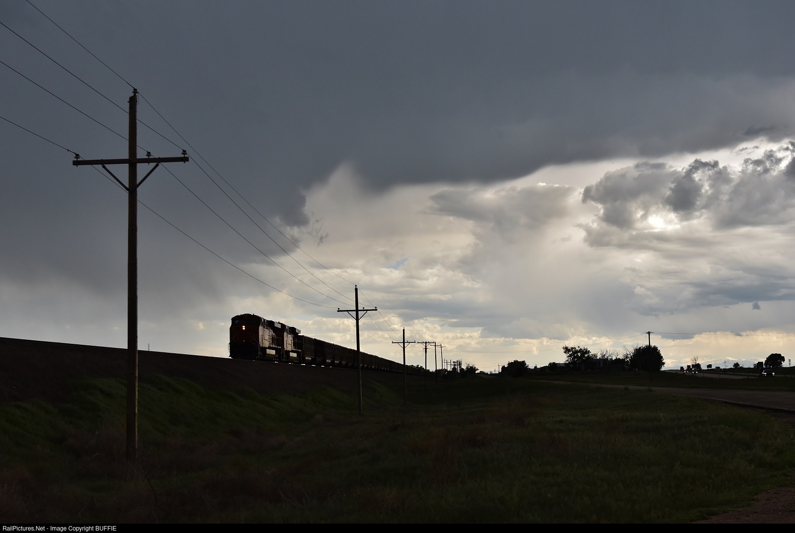 Storm clouds are brewing as BNSF 6395 (ES44AC) shoves a loaded coal towards Denver at Hudson, Colorado on the Brush Sub.