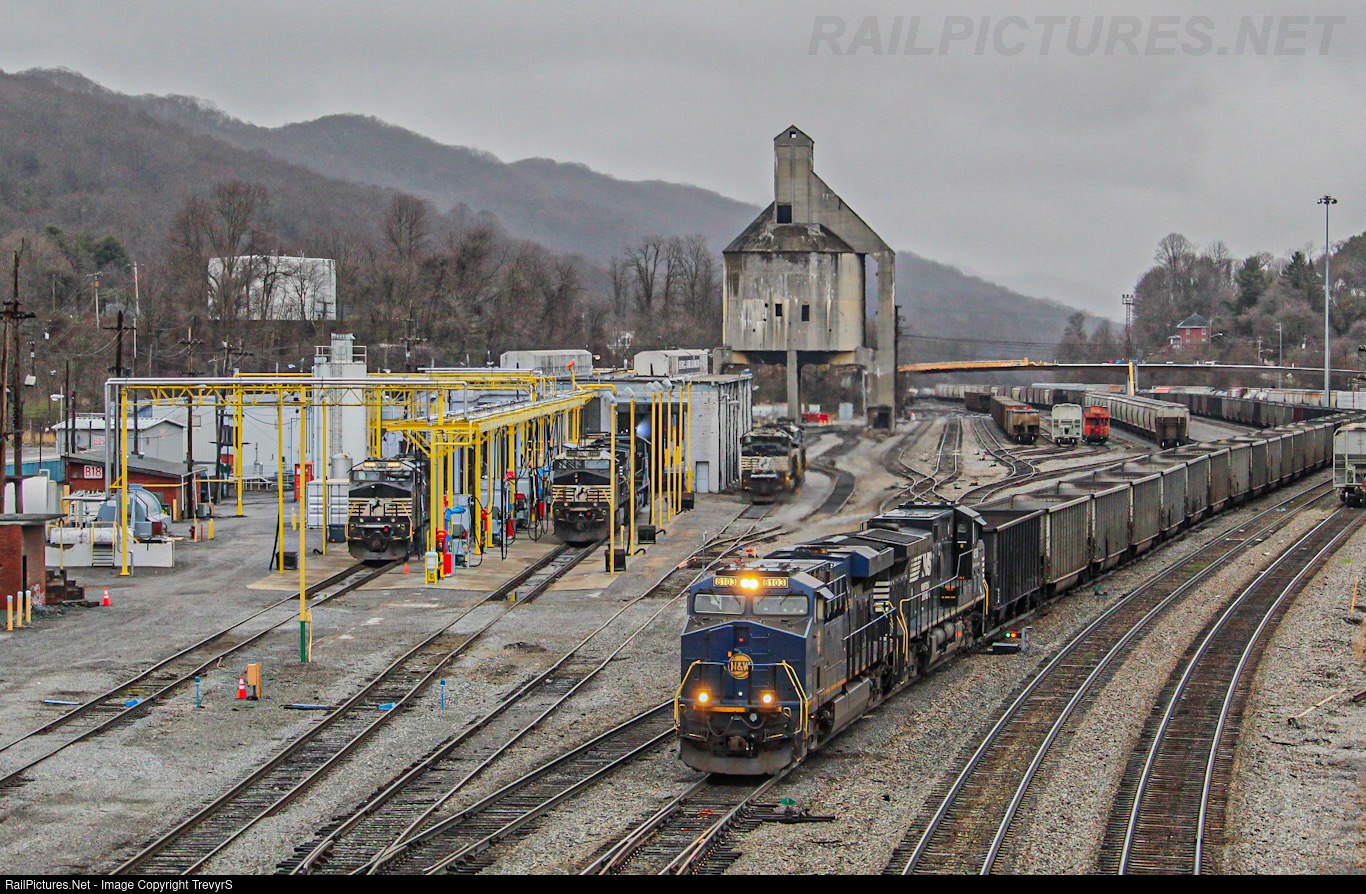 After a crew swap, NS 811 eases through the Bluefield, WV yard as it makes its way towards the coalfields. The Norfolk and Western heritage unit is on home rails, and looks great in the yard that once saw many coal drags a day pulled by giant Y class engines.