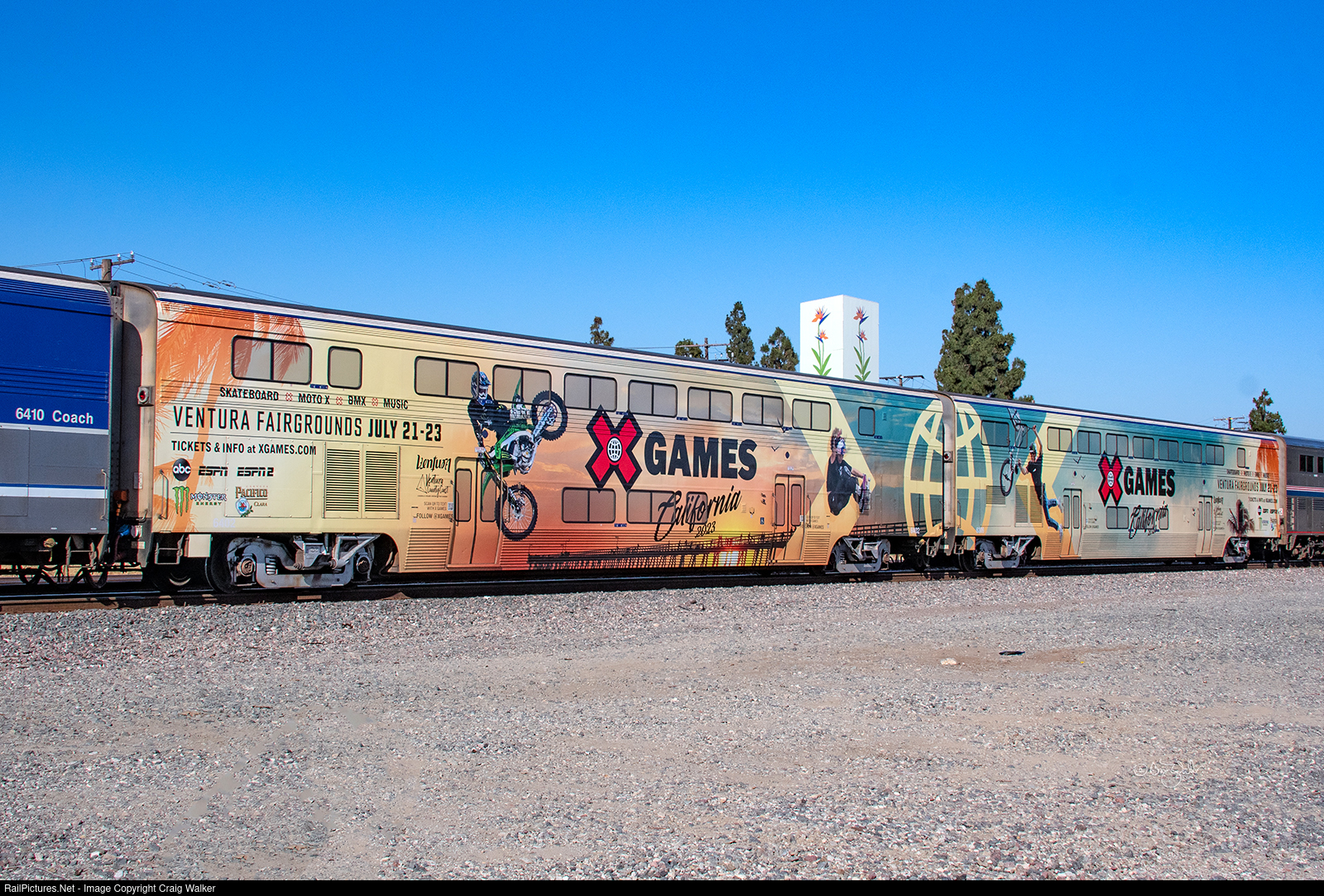 Amtrak has applied wraps to a pair of their Pacific Surfliner cars, coach 6402 (on the left), and coach/café car 6306 (on the right), to promote the upcoming X Games in Ventura in late July. These two cars are seen here on train 784, currently operating from Goleta to Irvine (rather than San Diego, thanks to shifting cliffs in San Clemente again), which means these cars will be seen along that part of California's coast that will be hosting the games. (Buena Park, California – July 7, 2023)