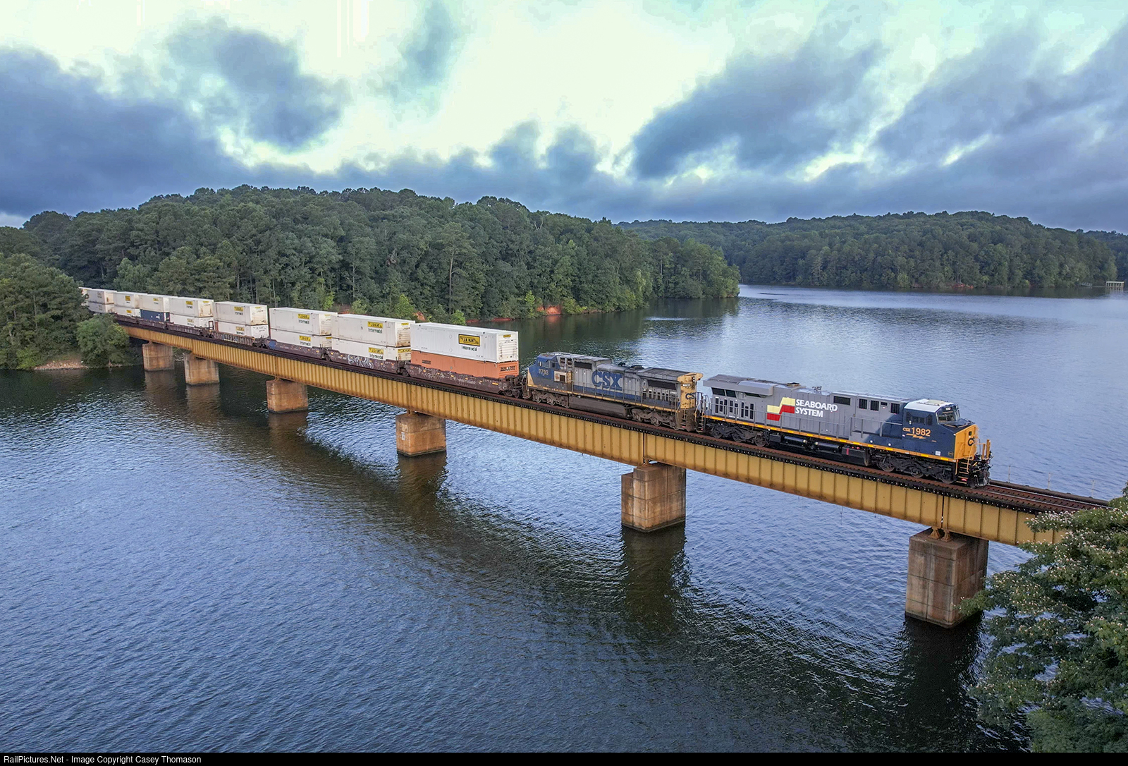 Working as the rear-end distributed power unit, Seaboard System 1982 shoves on the hind-end of train I14009 shortly after daybreak, crossing West Point Lake on the Chattahoochee River near LaGrange, GA. The train is headed north from the intermodal ramp at Fairburn, GA, to the Northwest Ohio Intermodal Facility