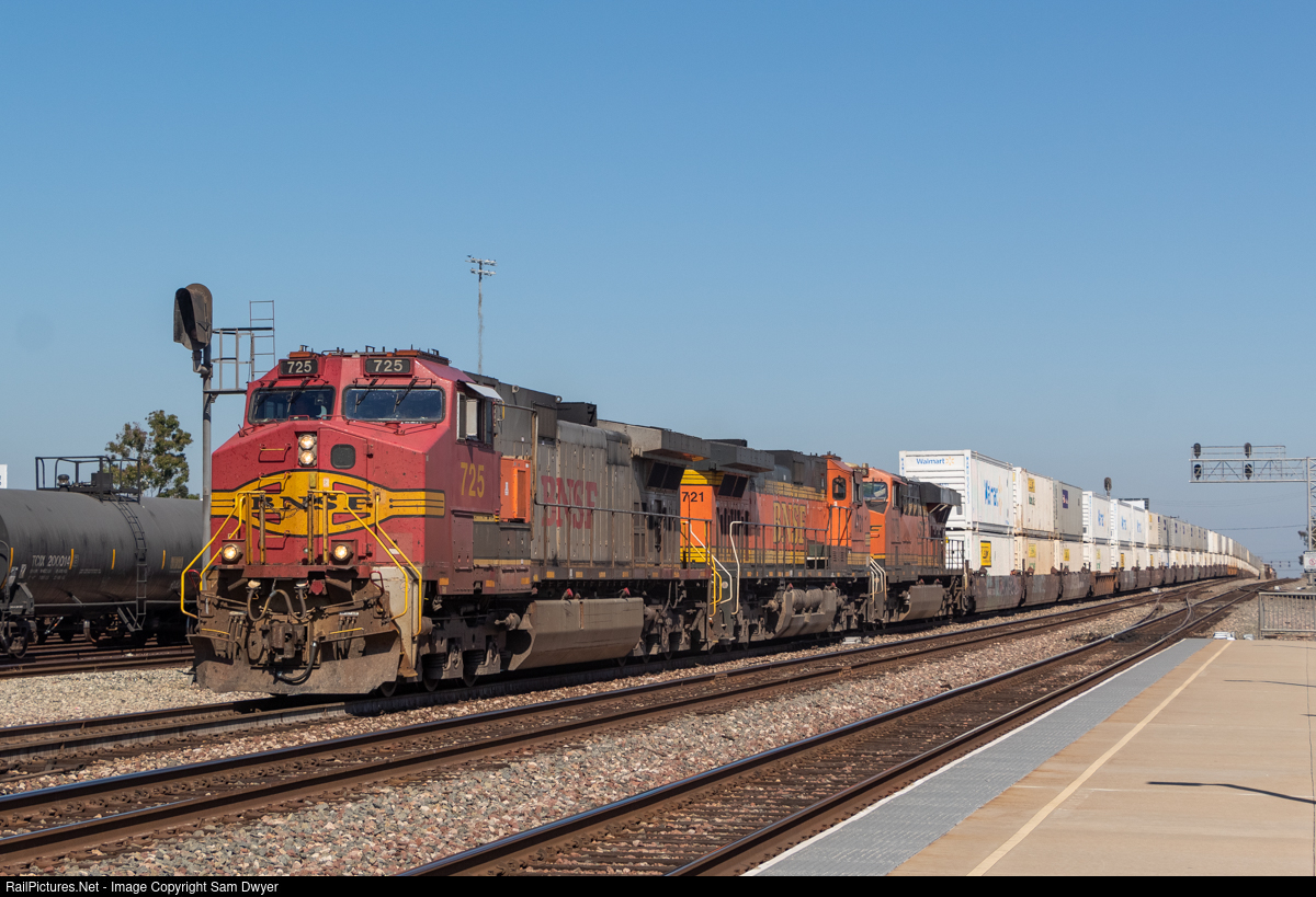 A Kansas City to Los Angeles intermodal ends its trip with a BNSF fakebonnet. When BNSF was newly formed, they acquired a handful of Dash 9s originally ordered by the Santa Fe railroad. Instead of painting these units into BNSF's iconic "pumpkin orange," these workhorses retained their ATSF Warbonnet scheme, this time with BNSF lettering. Railfans like to call these engines "fakebonnets," but for a Massachusetts railfan such as myself, these are pretty cool to see.