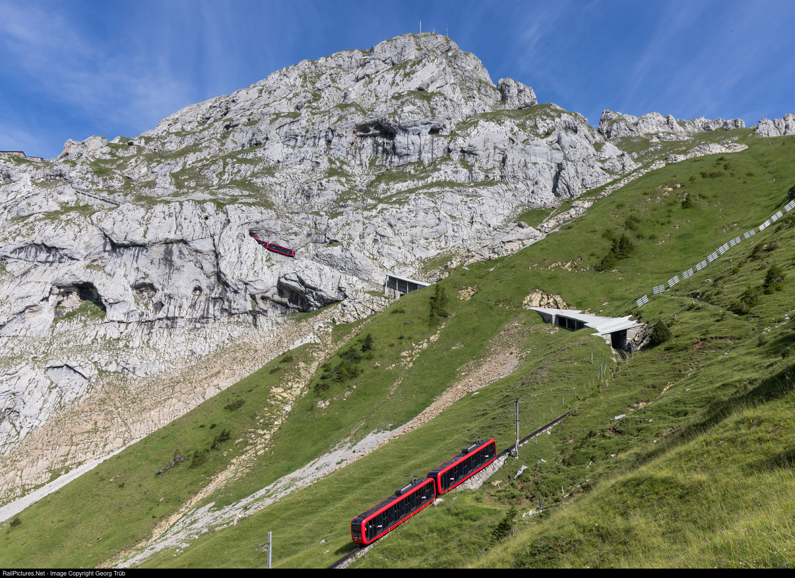 It's 10 AM an the half fleet of the Pilatus Bahnen can be seen running down from Pilatus Kulm to Alpnachstad as train CC 10. In the foreground Bhe 2/2 # 47 and # 48, and in the Eselwand (donkey wall), leaving the 55 meter long Eselwand tunnel, Bhe 2/2 # 42 and # 44. The mountain in the background is the Esel peak (2118 meter), part of the Pilatus massiv.