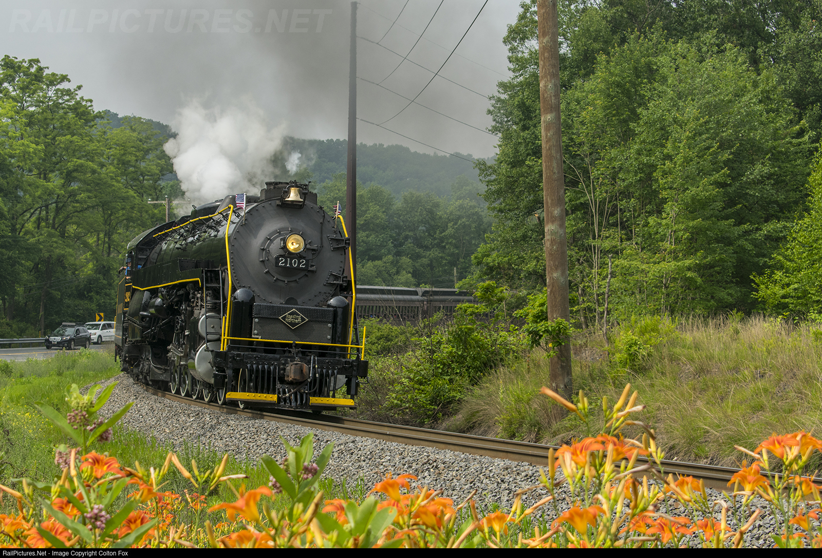 2102 leads the first Iron Horse Ramble of 2023 around the South Tamaqua Curve, passing a patch of vibrant daylilies on the morning of July 1, 2023. Up to this point, the weather had been uncooperative but the sun finally peeked out at just the right moment. Note the superelevation of the curve, which allows for higher track speeds.