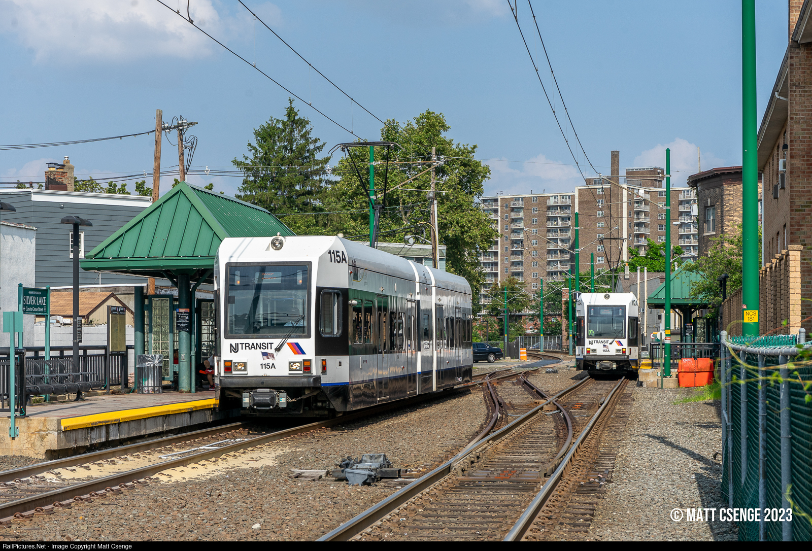 A pair of NJ Transit 3 section LRVs - 112 and 115 - (Kinki Sharyo, 1999-2004) are seen making their station stops at Silver Lake Station on the Newark Light Rail. The keen viewer will notice that the crossover between the two staggered platforms does not have overhead wires; this crossover was not installed for use by the light rail, but rather for Norfolk Southern freight trains! The Bloomfield Extension of the City Subway branch was built along the former Erie Railroad's Orange Branch, with infrastructure and operating agreements allowing NS to continue to serve remaining industries on the branch west of Franklin Ave. Nowadays freight operations on the branch have ceased, with the branch and much of the former New York and Greenwood Lake's Boonton Line being abandoned east of the Montclair Connection, which was completed in 2002 and merged the Montclair Branch and the Boonton Line into the Montclair-Boonton Line.