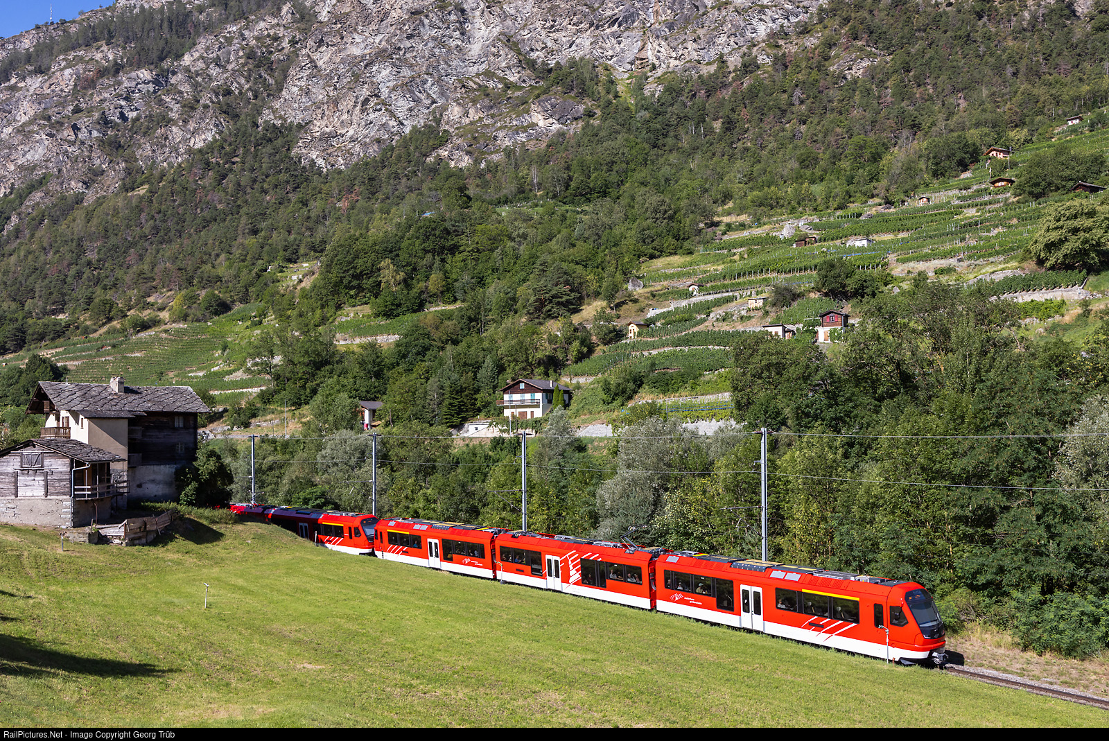 Brand new "Orion" trains ABeh 8/12 # 307 and # 306 of the Matterhorn-Gotthard-Bahn (MGB) are running the Regio Express 323 from Fiesch via Brig-Visp to Zermatt, near Neubrück in the Vispa valley. The MGB gets 12 of this "Orion" from StadlerRail now, 25 more are on order.